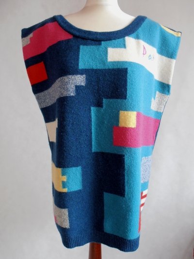 Kamizelka firmy Paco,wygląda jakby była zrobiona ze swetra.Pachy podwinięte ręcznie.Przód kolorowy.Tył gładki ,jednokolorowy.Włóczka 100% lambswool.Brak rozmiaru.Długość 74 cm.pod pachami 120 cm.