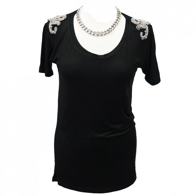 Klasyczna czarna bluzka z dekoltem, ozdobiona pięknymi pagonami