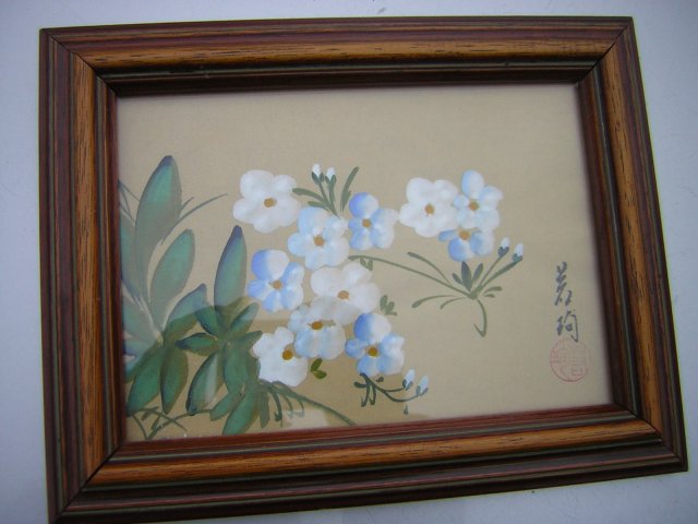 Na Jedwabiu Ręcznie malowany Obrazek. Sygnowany Orientalną sygnaturą; niezapominajki na Szczęście...w klasycznie orientalnej kompozycji. Ciekawe, inne...Kolory pięknie ze sobą współbrzmiące. Ozdoba i klasa...Oprawione w ramkę drewnianą, - kolorystycznie dobrze dobraną...do całości. Wykończenie satynowe.
