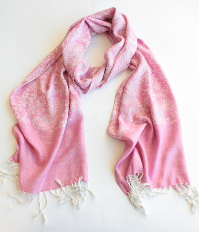 Miękki, duży szal we wzory typu paisley, miejscami przetykany bardzo subtelną, srebrną nitką.