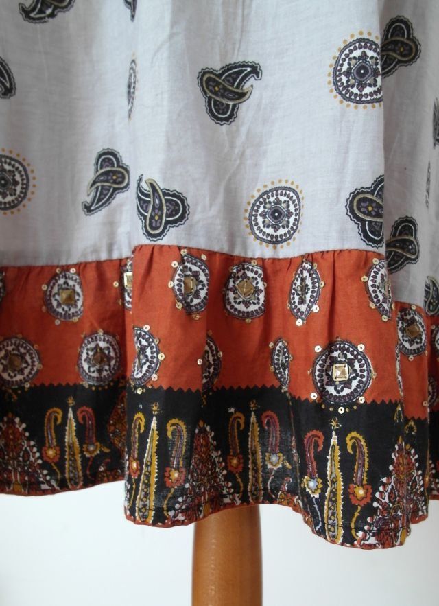 Stonowane kolory z mocniejszym akcentem w postaci pięknej falbany oraz karczku, na których mienią się drobne cekiny. Bardzo ciekawe połączenie kolorów. Z boku troczek do regulowania rozmiaru. Fajna pod sweter.