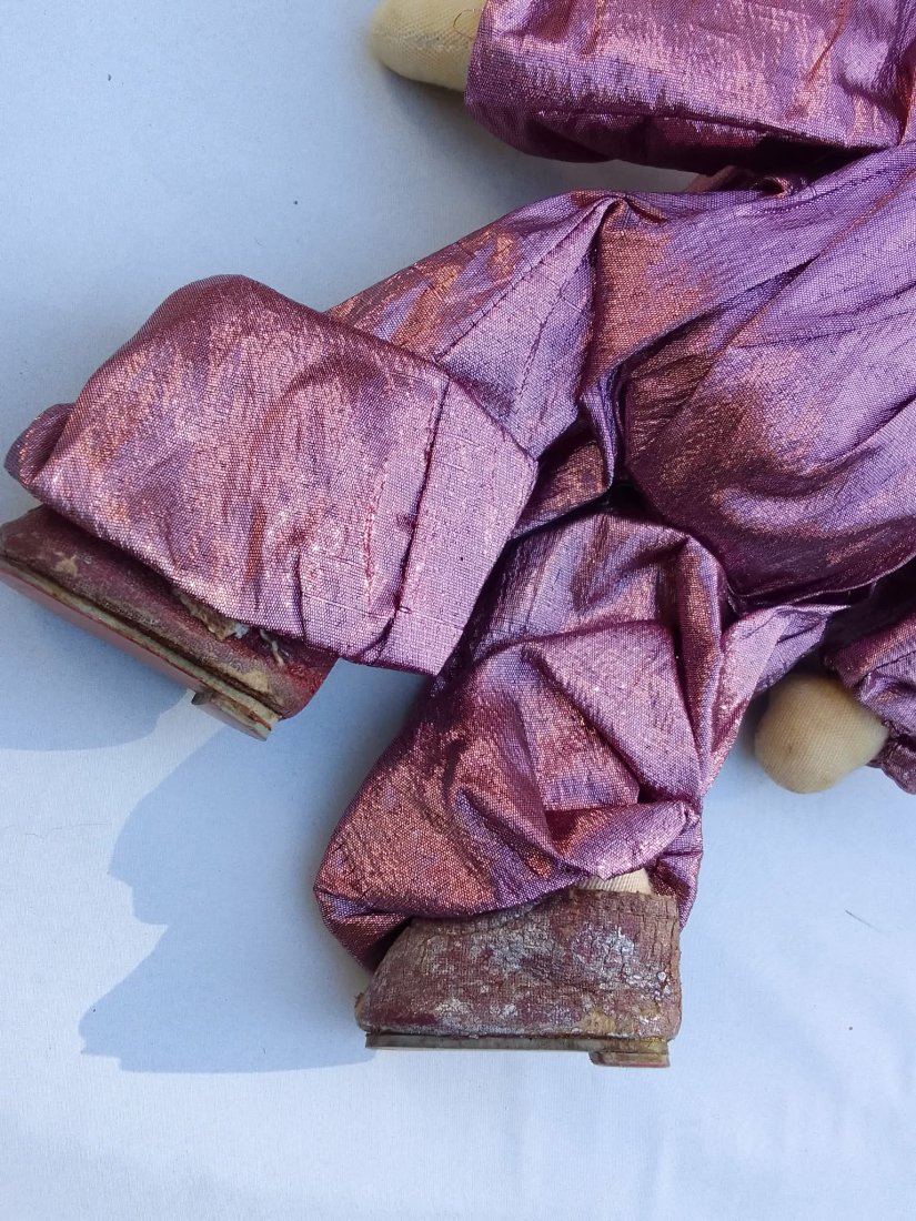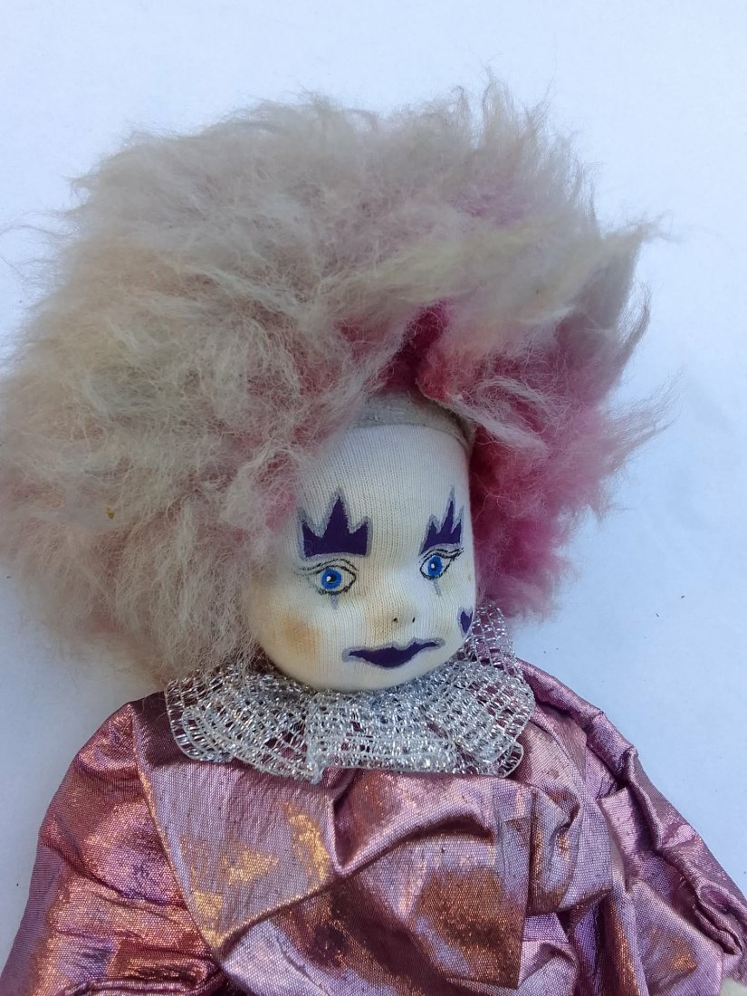 Wyjątkowa lalka typu pajac/clown, o wysokości ok. 35 cm, łącząca klasyczne elementy szmacianego tułowia z dekoracyjnymi detalami. Lalka ubrana jest w połyskującą kreację oraz skórzane buty, co nadaje jej eleganckiego i niebanalnego charakteru.