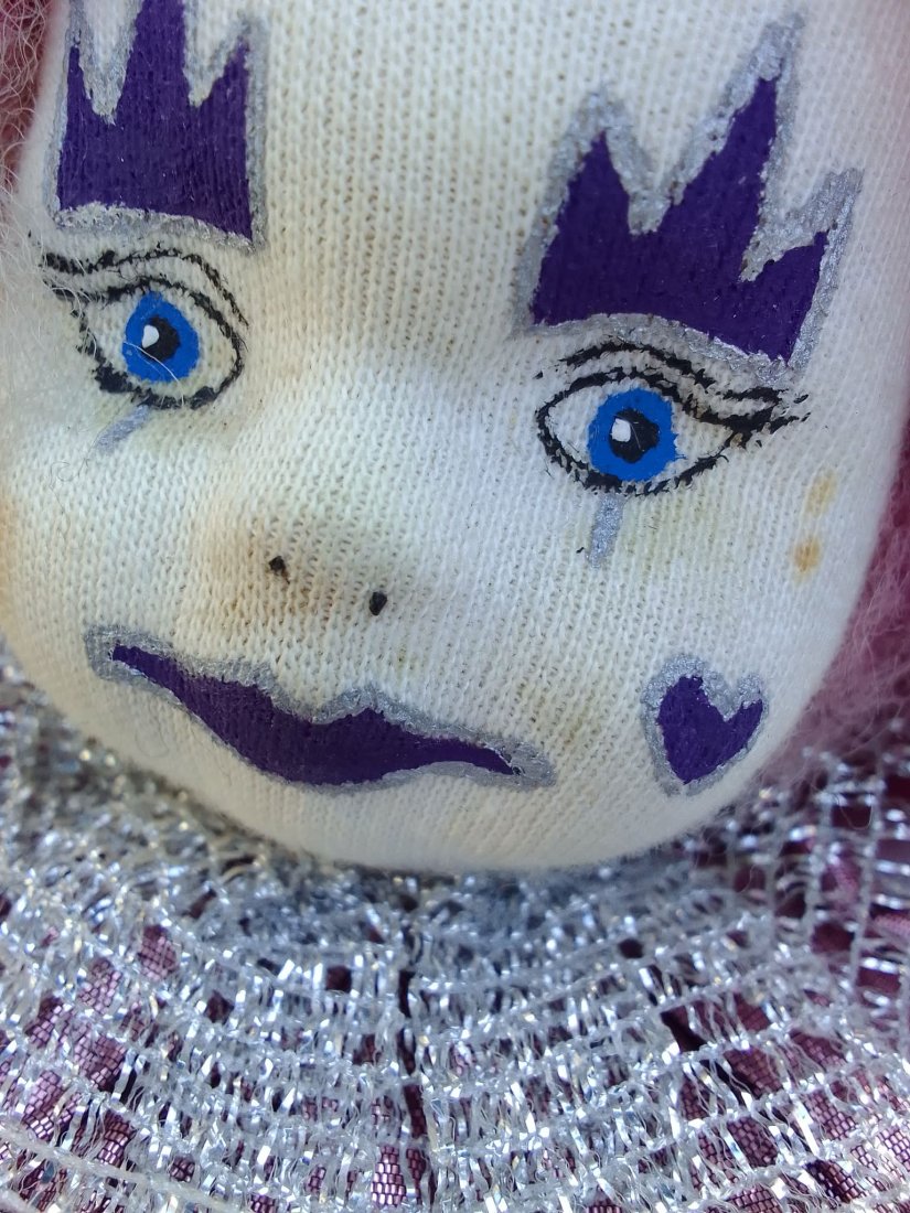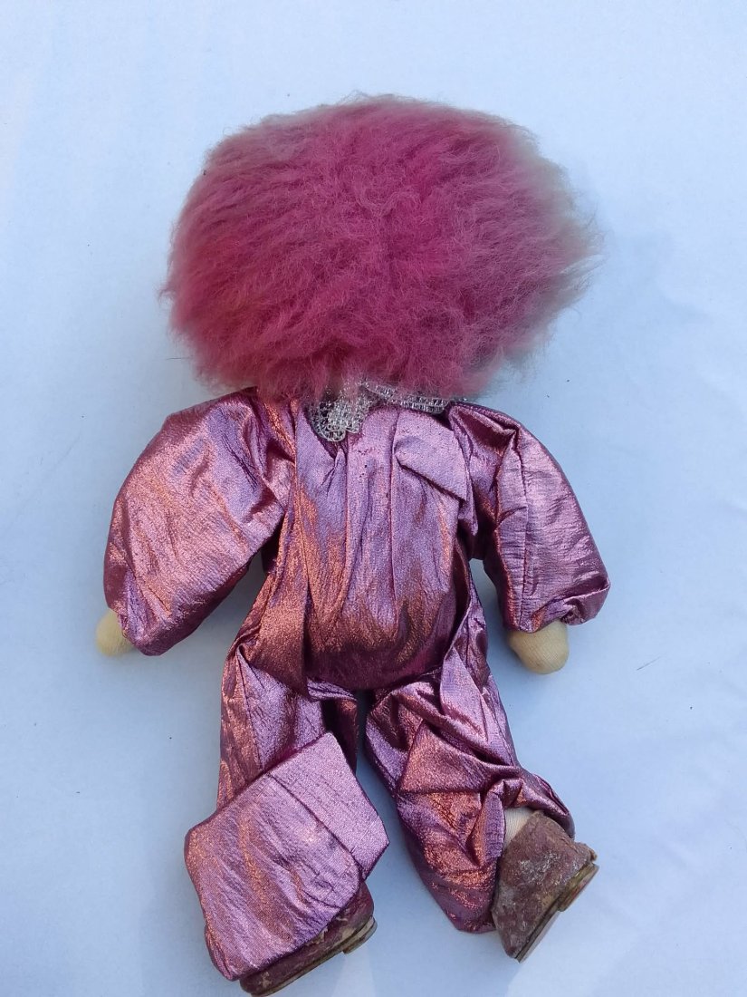 Twarz została starannie wymalowana, a głowa ozdobiona fioletową czupryną, nadającą jej ekspresyjny i zabawny wygląd. Stylizacja sugeruje współczesne wykonanie, ale charakter lalki sprawia, że może pełnić funkcję zarówno zabawki, jak i obiektu kolekcjonerskiego.
