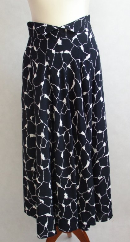 Spódnica z pełnego koła.Czarna w białe wzory.zapinana z tyłu na zamek.Pas szeroki 6 cm.z przodu wycięte dwa końce-zaprasowane.Od góry zaszyte zakładki.Dwie kieszenie boczne.Stan bardzo dobry.Długość 87 cm.pas 74 cm.