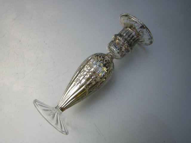 Pałacowy cienko szklany bardzo ciekawie zdobiony świecznik. Ryflowania, wykwintna forma i platynowe zdobienie od wewnątrz. Jakby na tłustą powierzenie zastosować farbę. W zależności od oświetlenia srebrzysty y lub złoty.Ciekawy, dekoracyjny - na zwykłą świecę. Nadaje się do wnętrz klasycznych i nowoczesnych, oraz na prezent.