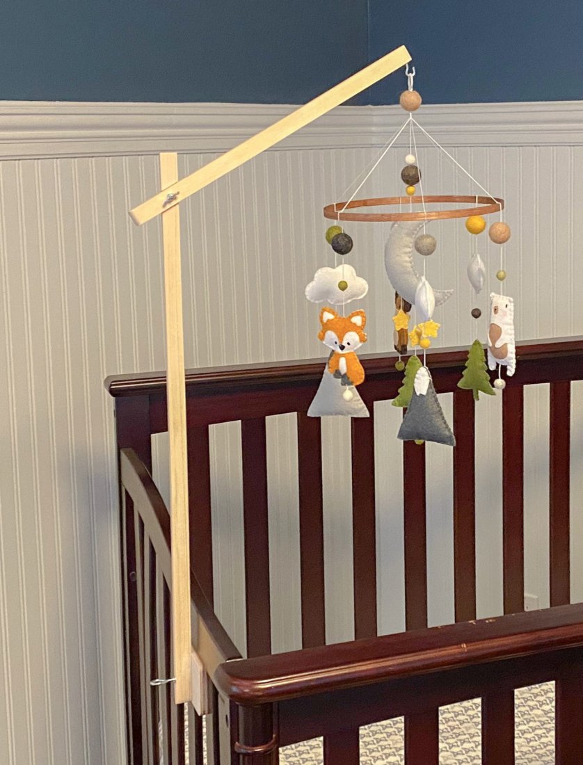 Ręcznie wykonany uchwyt z drewna sosnowego do karuzeli niemowlęcej. Stabilny montaż pod kątem 45° i wysokość 30 cm od oczu dziecka gwarantują bezpieczeństwo.