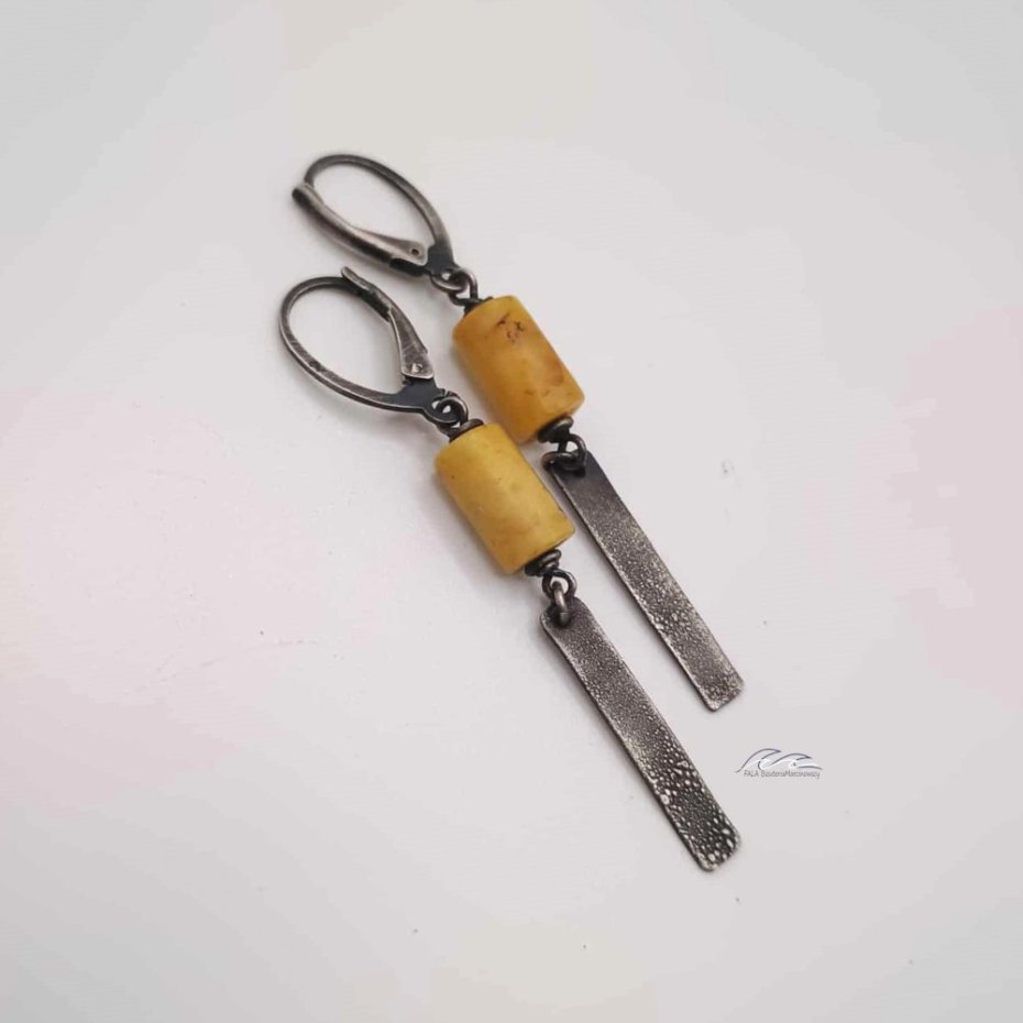 Kolczyki wykonane ręcznie ze srebra pr. 925, oraz wałeczków mlecznego bursztynu.