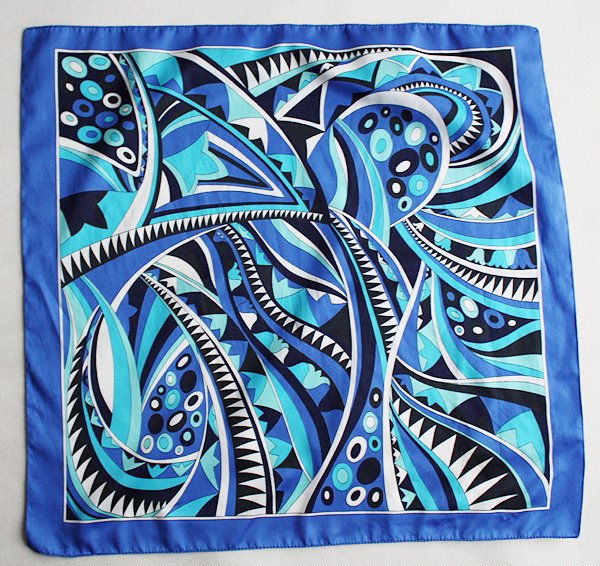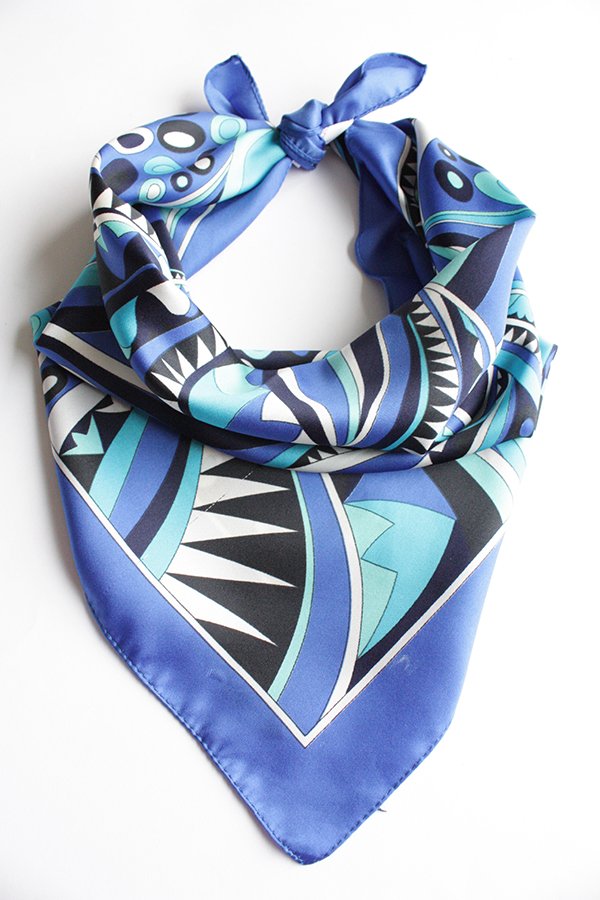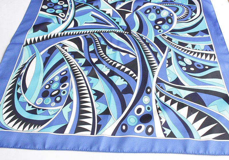 Niezwykła geometryczna chusta w odcieniach błękitu i granatu z lekkiego, zwiewnego materiału.