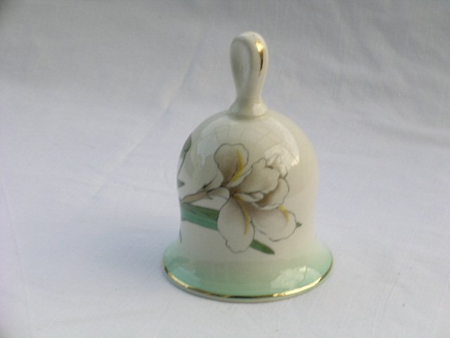 Duży porcelanowy dzwonek jadalniano-celebracyjny, sygnowany Palissy, z kwiatowej serii Royale Collection. Ecru szlachetnej porcelany i wytworne zdobienie dookoła. Złocenia i błyszczące szkliwienie. Przyjemnie dźwięczy :) 8 x 11 cm. Stan zachowania bardzo dobry. Świetny na elegancki i oryginalny prezent :) A jaki dzwięczny :)