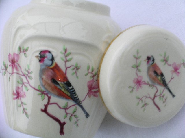 Porcelanowe naczynko łazienkowe z ptasio-kwiatowej serii, sygnowane jakością Palissy Worcester. Ecru tła, delikatne ozdobne ryflowanie i barwność wzoru. Złocenie wieczka. Dół 4,5; pękatość 6; wys. 7,5 cm. Stan zachowania bardzo dobry. Elegancja i klasa.
