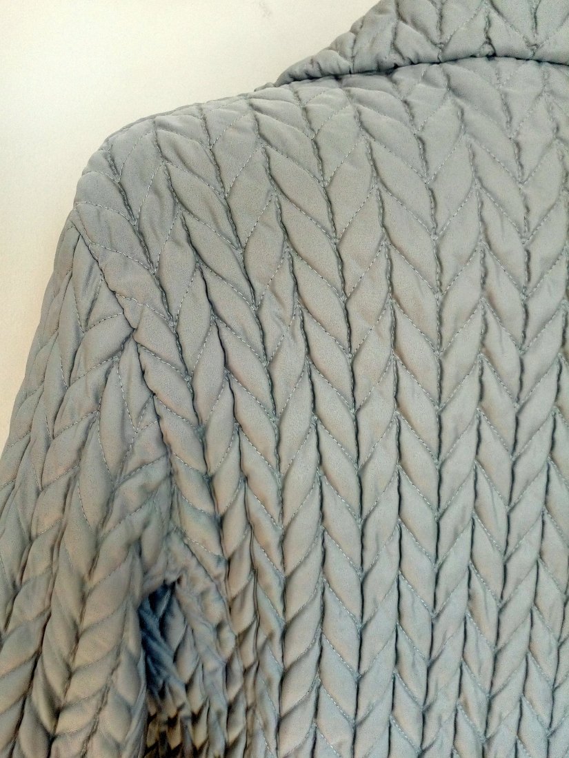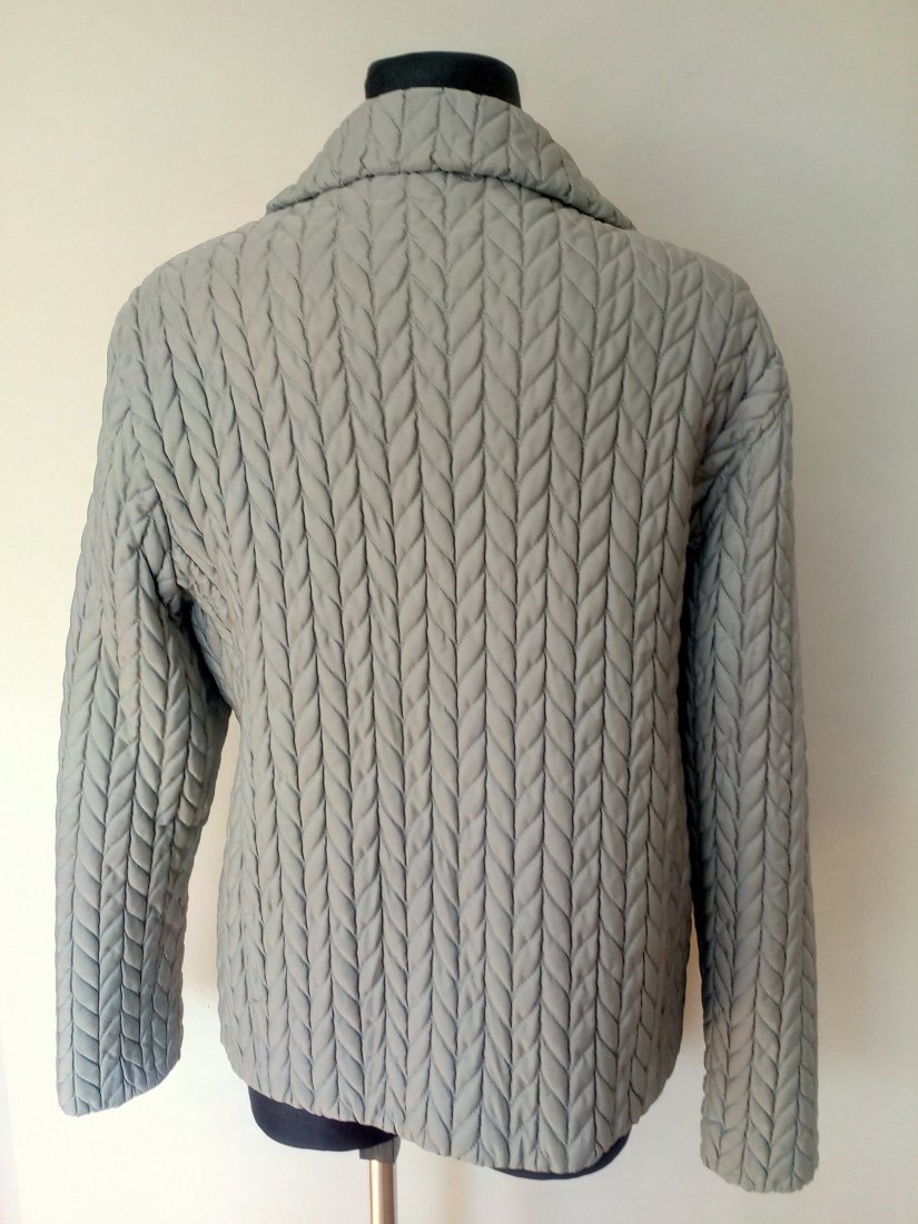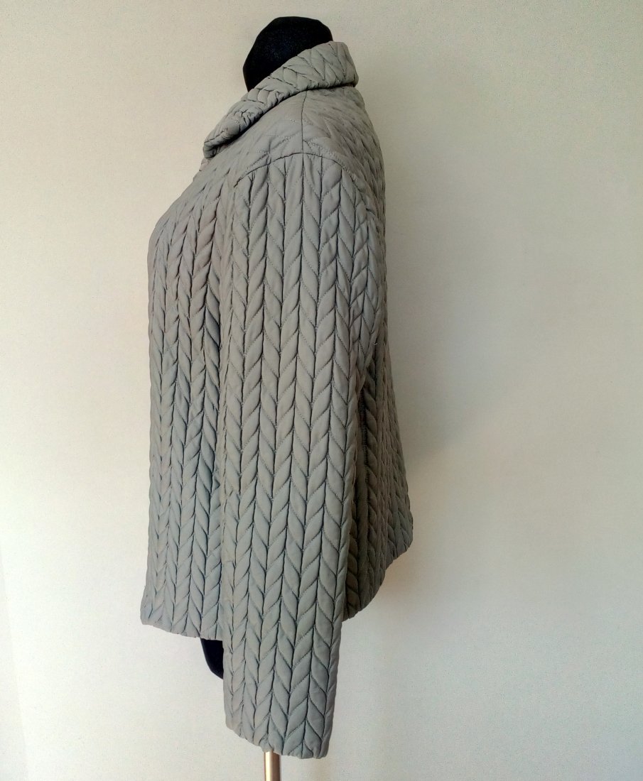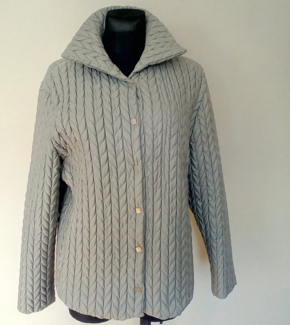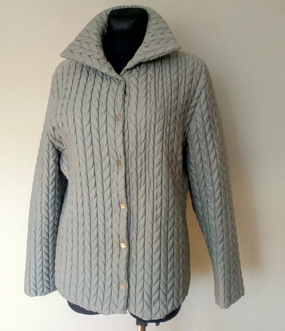 Elegancka, pięknie pikowana kurtka jesienna, zapinana na zatrzaski, z przodu pionowo wpuszczane kieszenie z zamkami, kolor kurtki kamienna zieleń, od środka dopasowana kolorystycznie podszewka