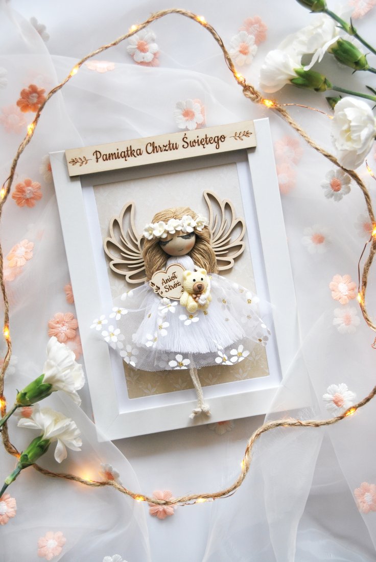 Delikatny Anioł Stróż to ręcznie wykonana dekoracja, stworzona z dbałością o każdy detal. Umieszczony jest w eleganckiej, białej ramce. Subtelna sukienka z tiulu ozdobiona kwiatowymi aplikacjami, drewniane skrzydełka oraz drobne dodatki nadają całości lekkości i dziewczęcego uroku.