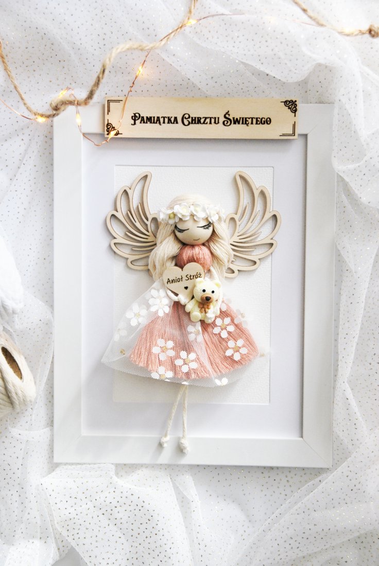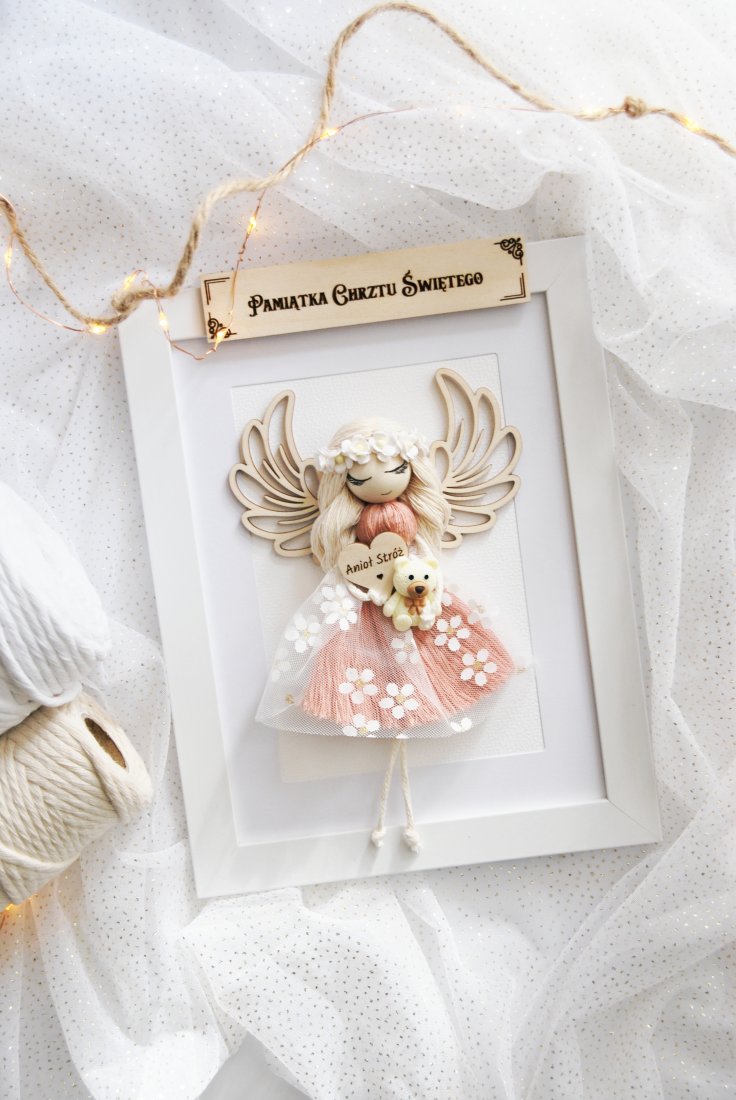 Delikatny Anioł Stróż w odcieniu różu to ręcznie wykonana dekoracja, stworzona z dbałością o każdy detal. Umieszczony jest w eleganckiej, białej ramce. Subtelna sukienka z tiulu ozdobiona kwiatowymi aplikacjami, drewniane skrzydełka oraz drobne dodatki nadają całości lekkości i dziewczęcego uroku.
