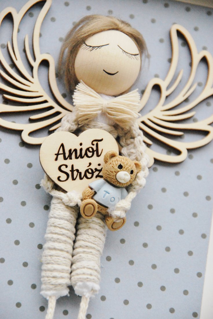 Dzięki subtelnemu połączeniu drewna, sznurka i dekoracyjnego tła, całość prezentuje się niezwykle elegancko i ponadczasowo. To pamiątka, która nie tylko ozdobi dziecięcy pokój, ale także stanie się symbolem opieki i miłości.