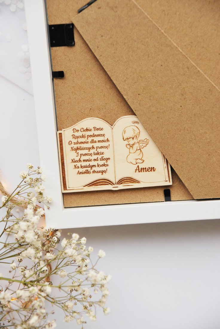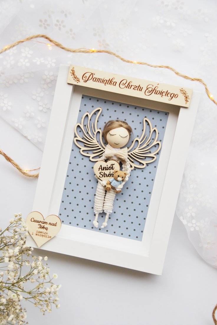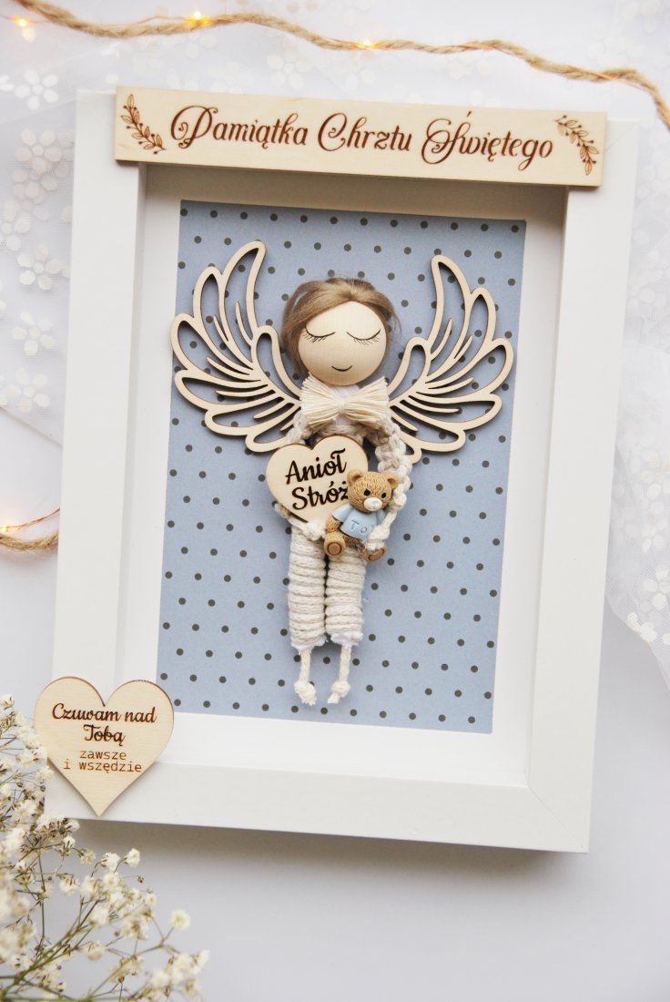 Wyjątkowa, ręcznie wykonana pamiątka Chrztu Świętego, stworzona z myślą o najpiękniejszych chwilach w życiu dziecka. W eleganckiej białej ramce znajduje się uroczy aniołek z naturalnych materiałów, z delikatnymi, drewnianymi skrzydłami i serduszkiem z grawerem "Anioł Stróż".