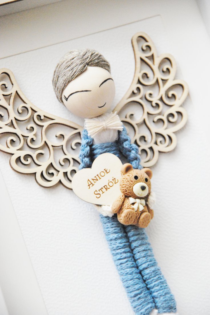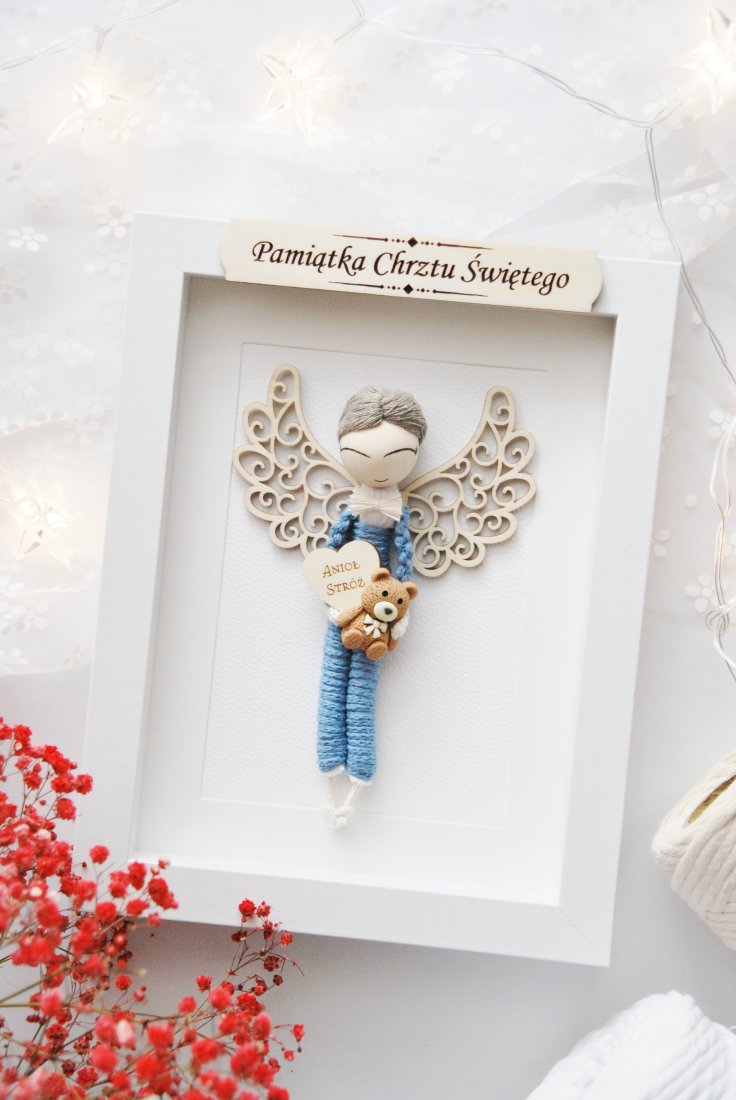 Wyjątkowa, ręcznie wykonana pamiątka Chrztu Świętego, stworzona z myślą o najpiękniejszych chwilach w życiu dziecka. W eleganckiej białej ramce znajduje się uroczy aniołek z naturalnych materiałów, z delikatnymi, drewnianymi skrzydłami, misiem i serduszkiem z grawerem "Anioł Stróż".