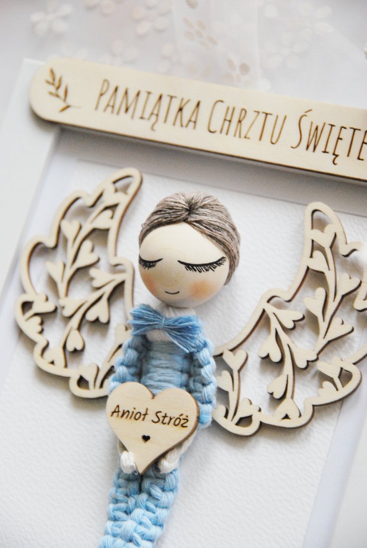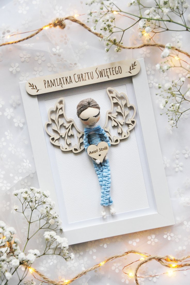 Wyjątkowa, ręcznie wykonana pamiątka Chrztu Świętego, stworzona z myślą o najpiękniejszych chwilach w życiu dziecka. W eleganckiej ramce znajduje się uroczy aniołek z naturalnych materiałów, z delikatnymi, drewnianymi skrzydłami i serduszkiem z grawerem "Anioł Stróż".
