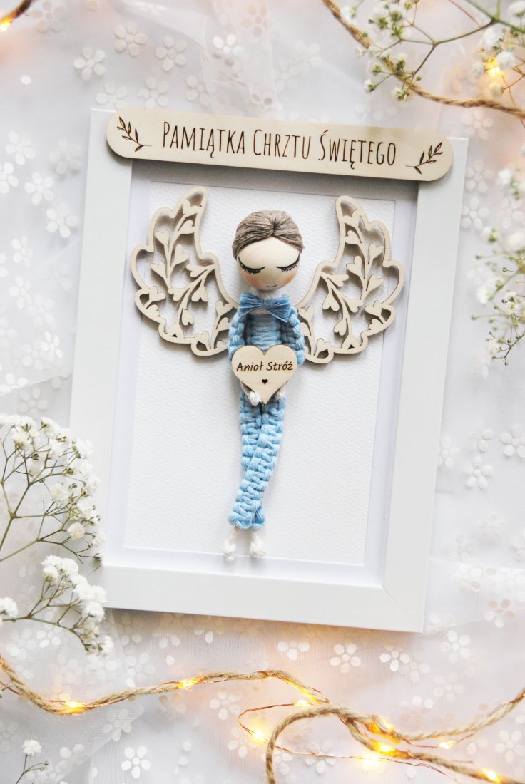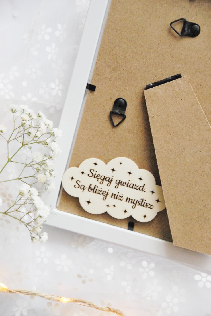 Dzięki subtelnemu połączeniu drewna, sznurka i jasnego tła, całość prezentuje się niezwykle elegancko i ponadczasowo. To pamiątka, która nie tylko ozdobi dziecięcy pokój, ale także stanie się symbolem opieki i miłości. Z tyłu ramki znajduje się ozdobna tabliczka z pięknym hasłem.