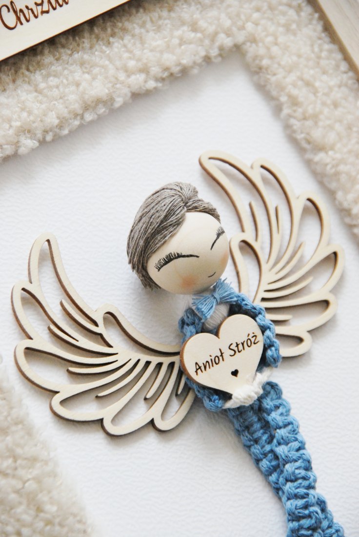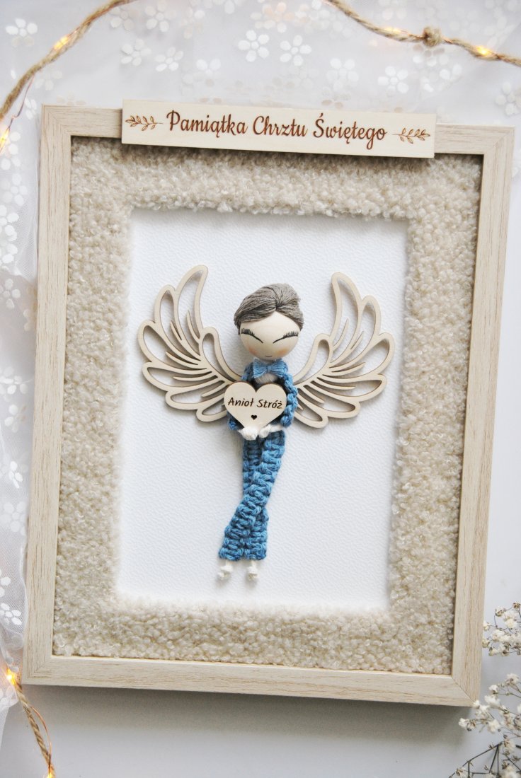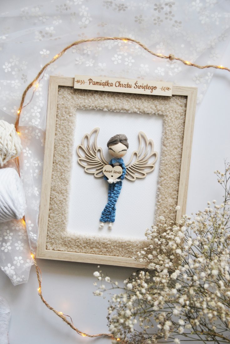 Wyjątkowa, ręcznie wykonana pamiątka Chrztu Świętego, stworzona z myślą o najpiękniejszych chwilach w życiu dziecka. W eleganckiej ramce znajduje się uroczy aniołek z naturalnych materiałów, z delikatnymi, drewnianymi skrzydłami i serduszkiem z grawerem "Anioł Stróż".