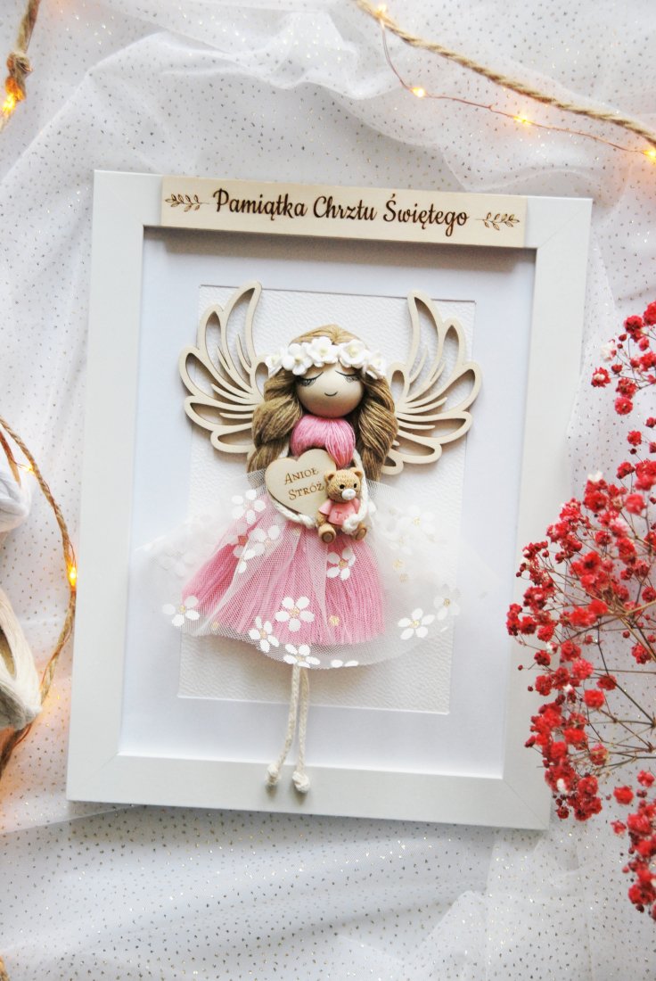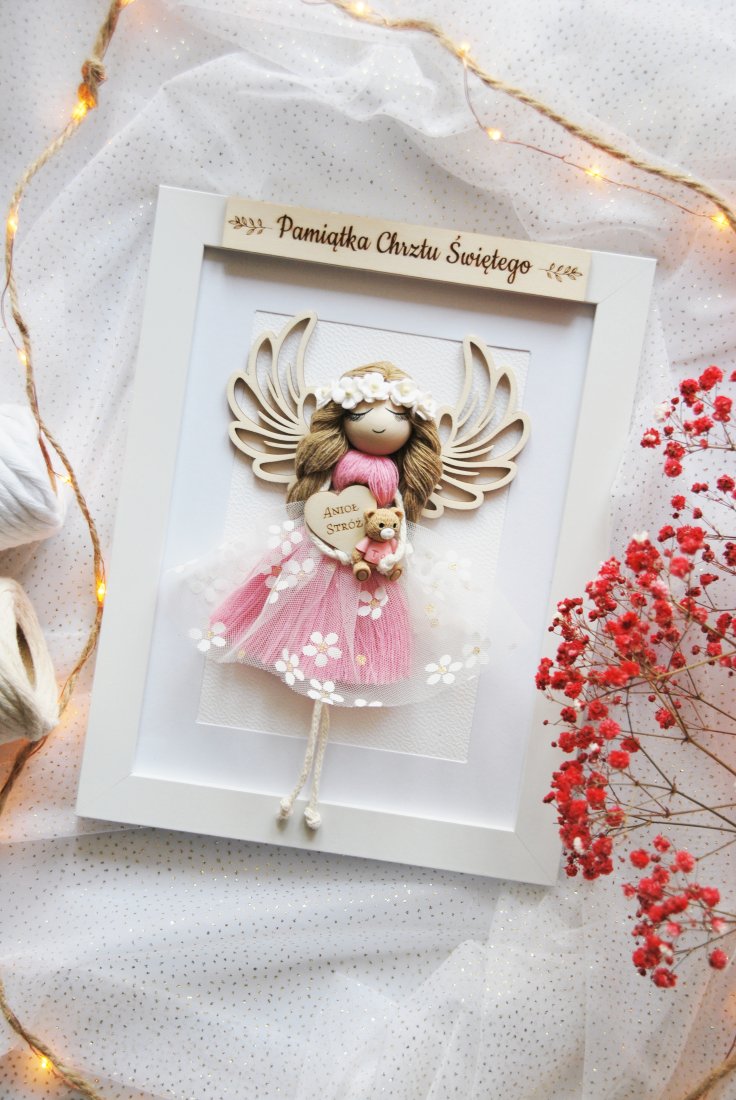 Oryginalna, ręcznie wykonana Pamiątka Chrztu Świętego - aniołek w ramce przeznaczony dla dziewczynki - w kolorze różowym.