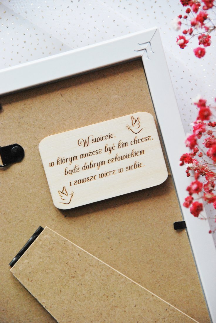 Z tyłu ramki znajduje się tabliczka z pięknymi życzeniami.