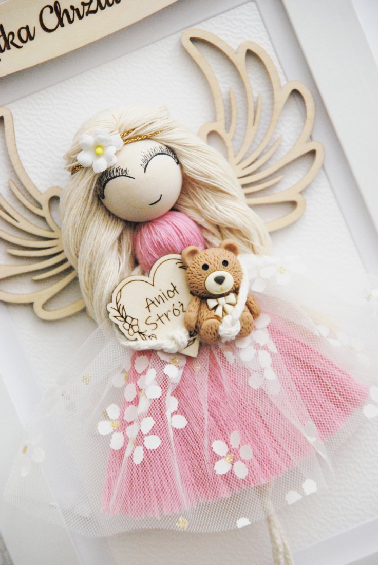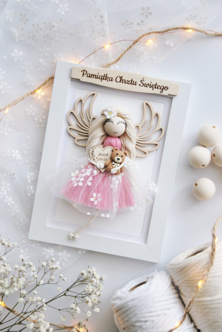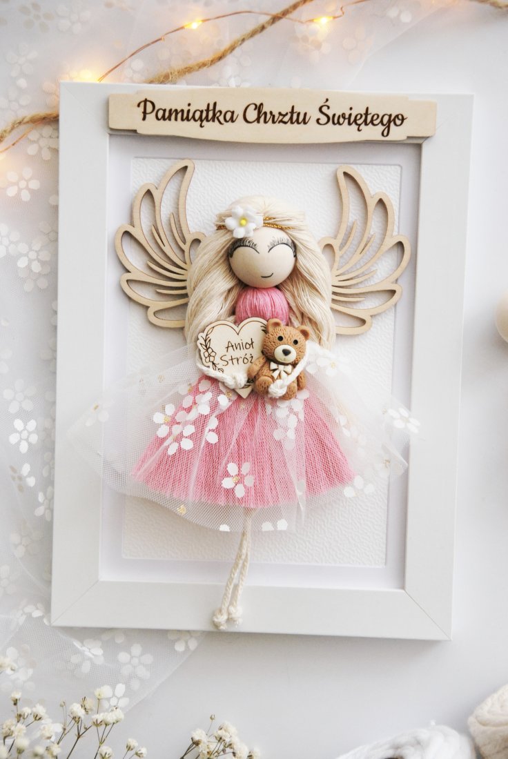 Oryginalna, ręcznie wykonana Pamiątka Chrztu Świętego - aniołek w ramce przeznaczony dla dziewczynki - w różowym kolorze.