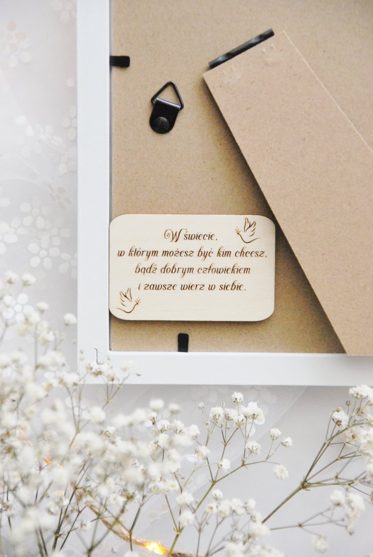 Z tyłu ramki znajduje się tabliczka z pięknymi życzeniami: W świecie, w którym możesz być kim chcesz, bądź dobrym człowiekiem i zawsze wierz w siebie.
