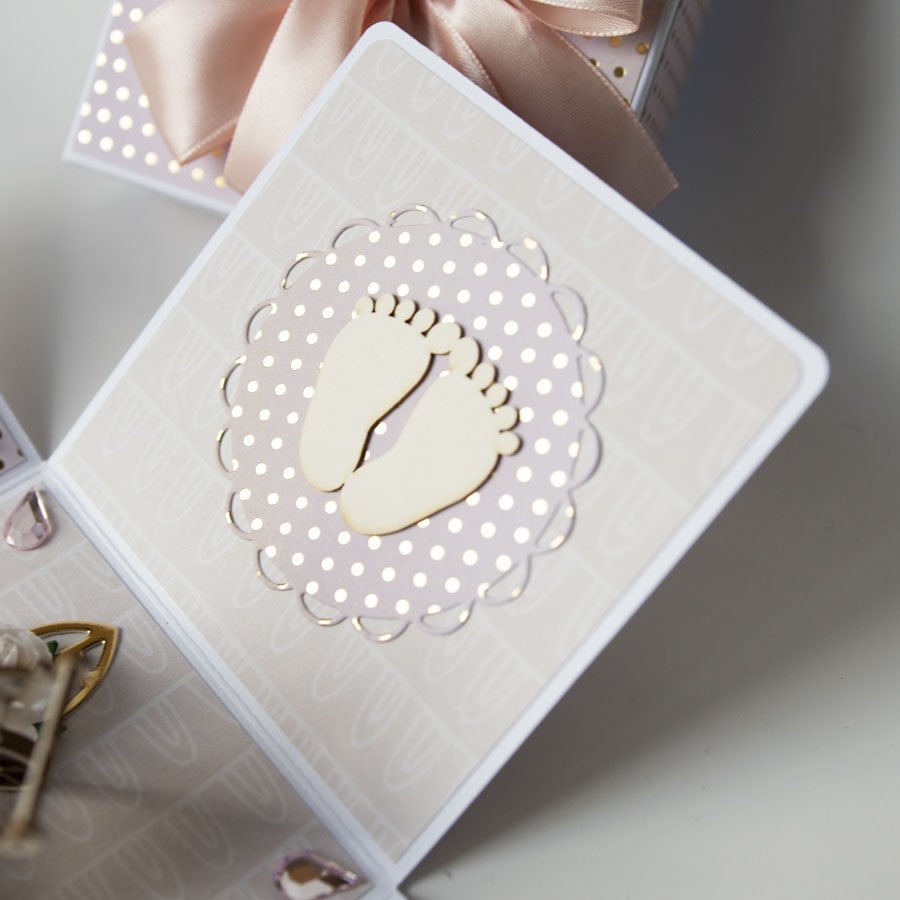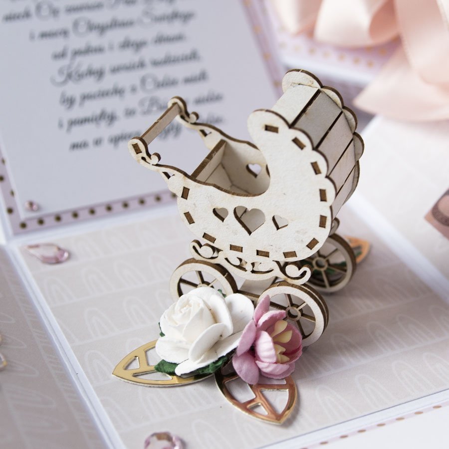 Złożone pudełeczko ma wymiary 10x10x10cm, po rozłożeniu aż 30 cm szerokości. Na ściankach znajduje się miejsce na pieniądze (zwija się je w rulonik i przewiązuje kokardą), motyw dziecięcych stópek, życzenia oraz miejsce na podpis osoby wręczającej prezent. Na środku miniaturowy wózek i papierowe kwiaty.