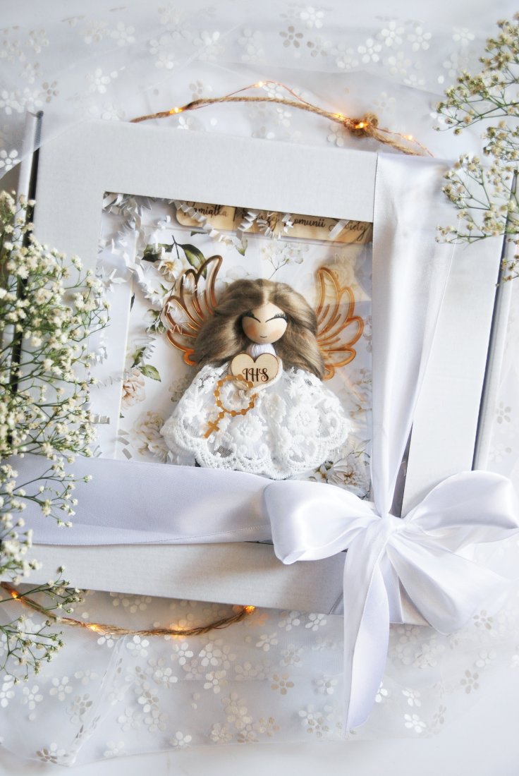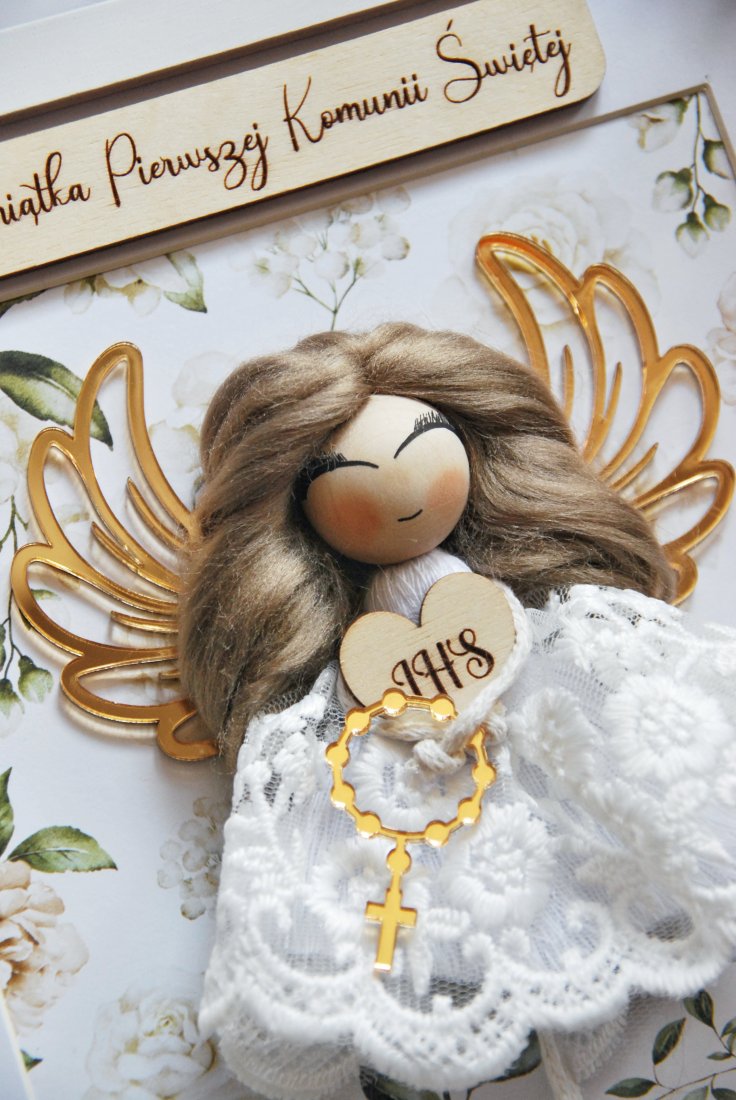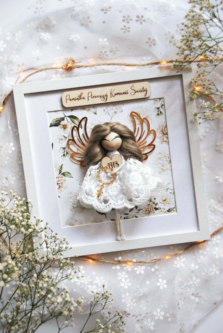 To nie jest zwykły prezent komunijny. To starannie skomponowana dekoracja, która po uroczystości trafia na ścianę i przez lata przypomina o tym szczególnym dniu. Aniołek wykonany jest ręcznie z dbałością o każdy detal - od koronkowej sukienki, przez złocone skrzydła, aż po drewnianą tabliczkę z napisem i grawerowanym sercem.