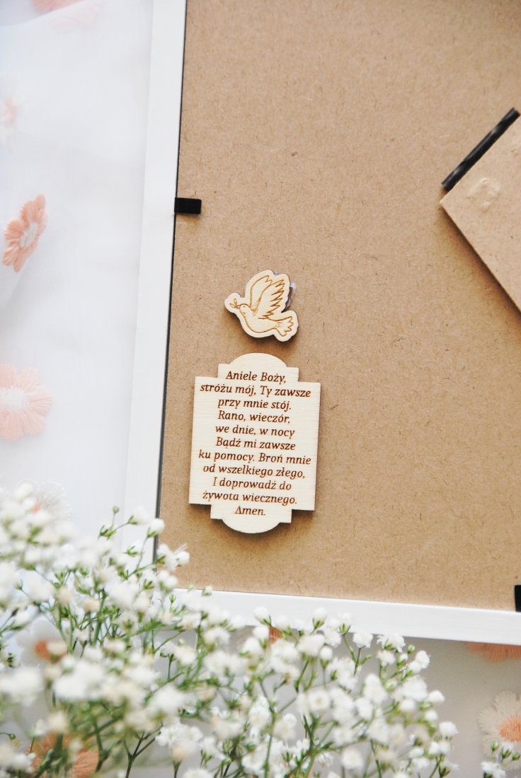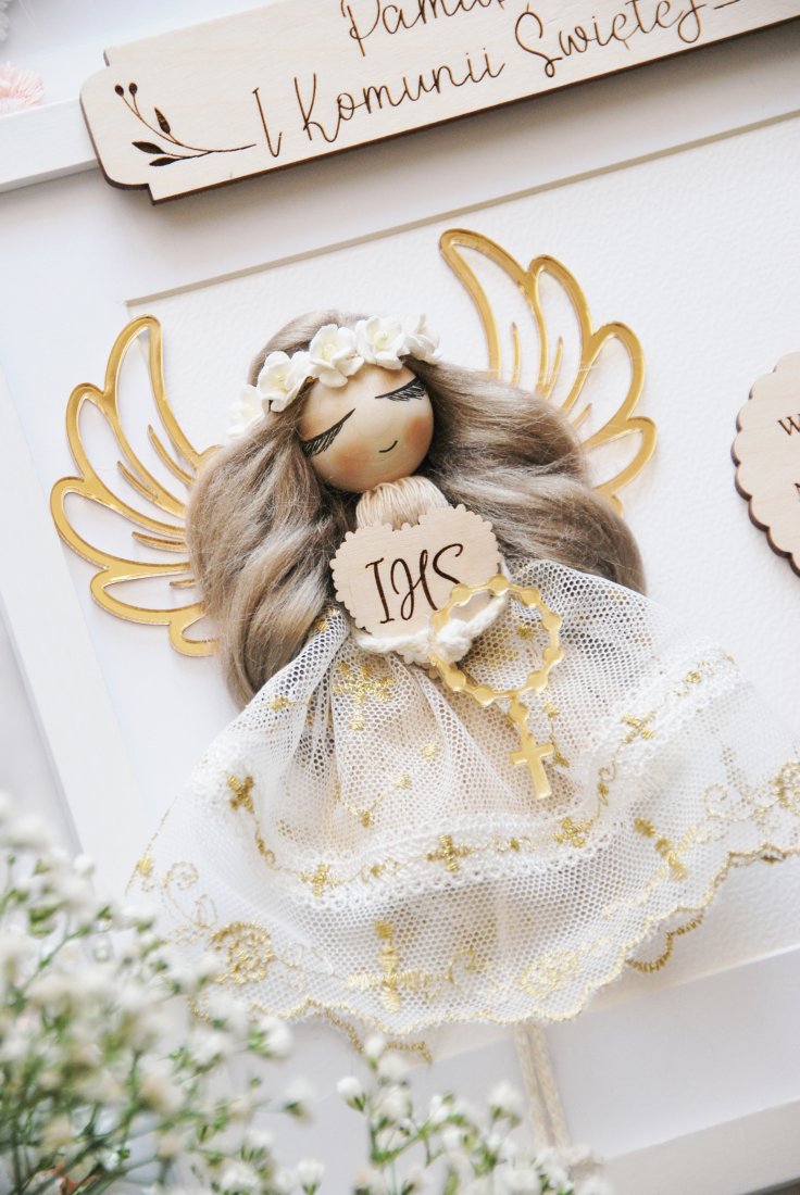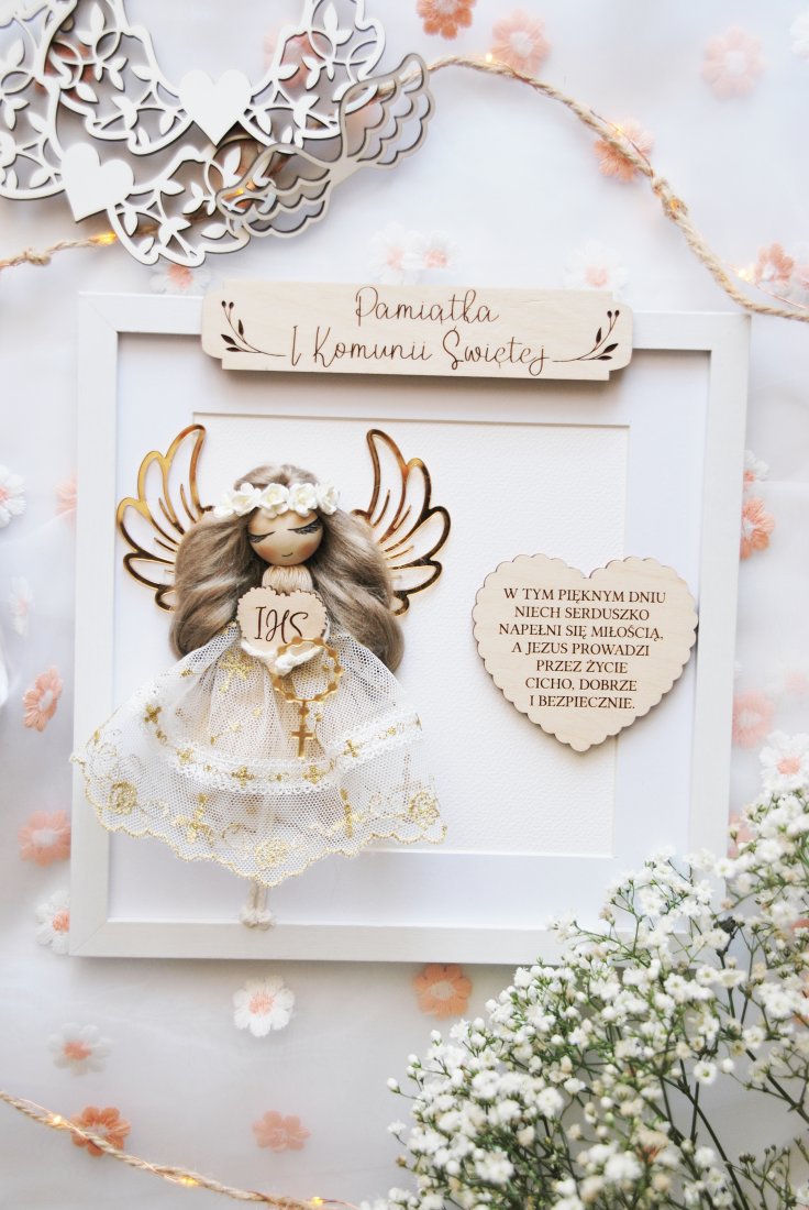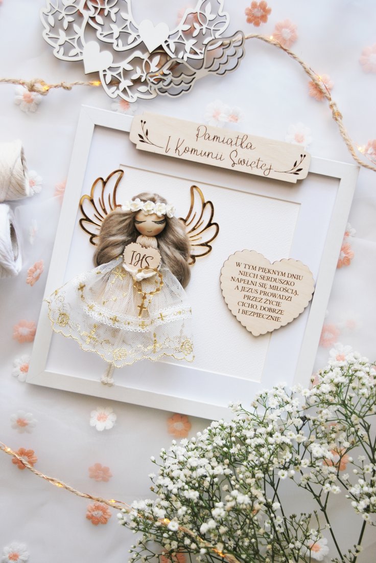 To nie jest zwykły prezent komunijny. To starannie skomponowana dekoracja, która po uroczystości trafia na ścianę i przez lata przypomina o tym szczególnym dniu. Aniołek wykonany jest ręcznie z dbałością o każdy detal - od koronkowej sukienki, przez złocone skrzydła, aż po drewnianą tabliczkę z napisem i grawerowanym sercem z życzeniami.