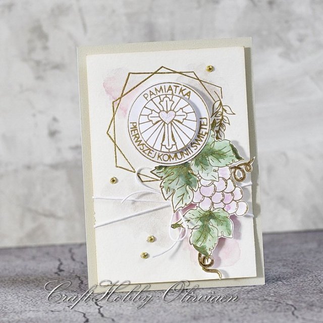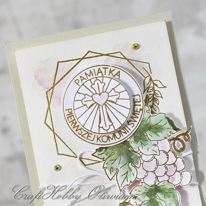 Kartka komunijna wykonana z bezkwasowych papierów do scrapbookingu, ozdobiona ręcznie malowanym perłowym akwarelowym tłem, stemplowanymi i embossowanymi na złoto motywami ramki, warstwowego okrągłego napisu i winogrona kolorowanego akwarelami z perłowym połyskiem, z dodatkiem woskowanego sznureczka i złotych perełek. Całość pięknie błyszczy pod światło.