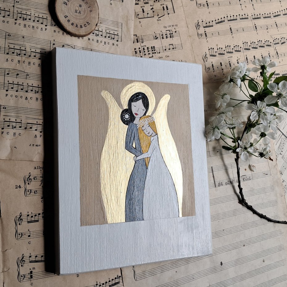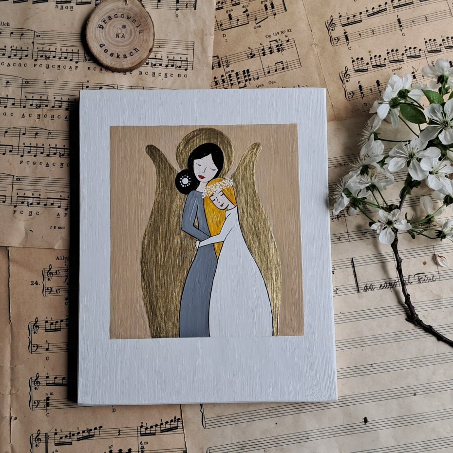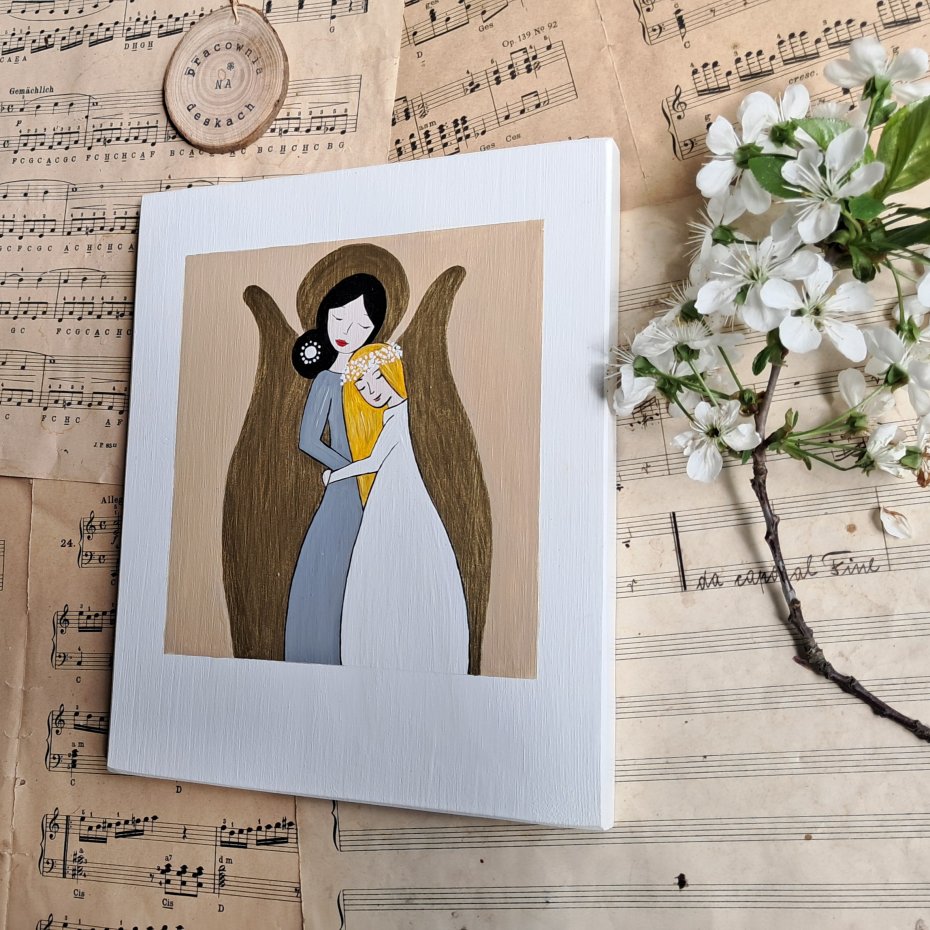 Obrazek malowany na drewnianej desce która może posiadać drobne niedoskonałości charakterystyczne dla drewna, całość malowana ręcznie, farbami akrylowymi ,zabezpieczona.