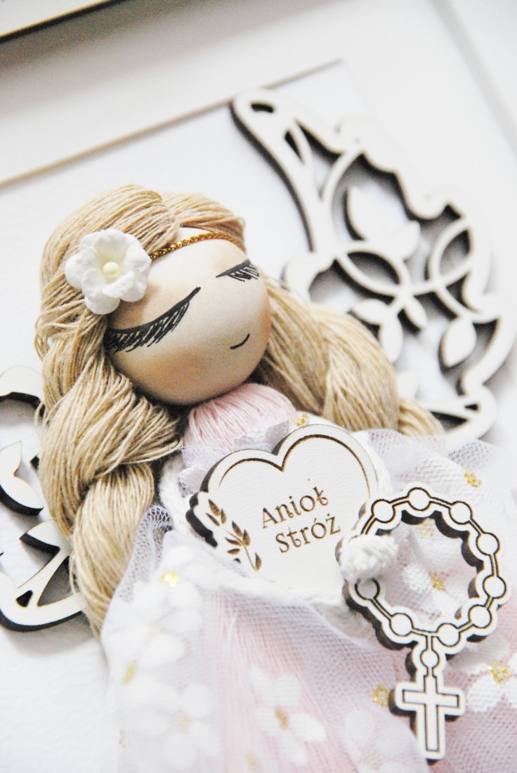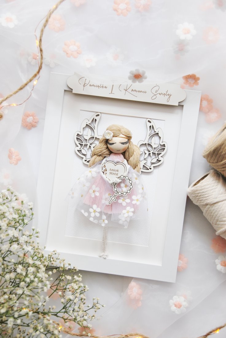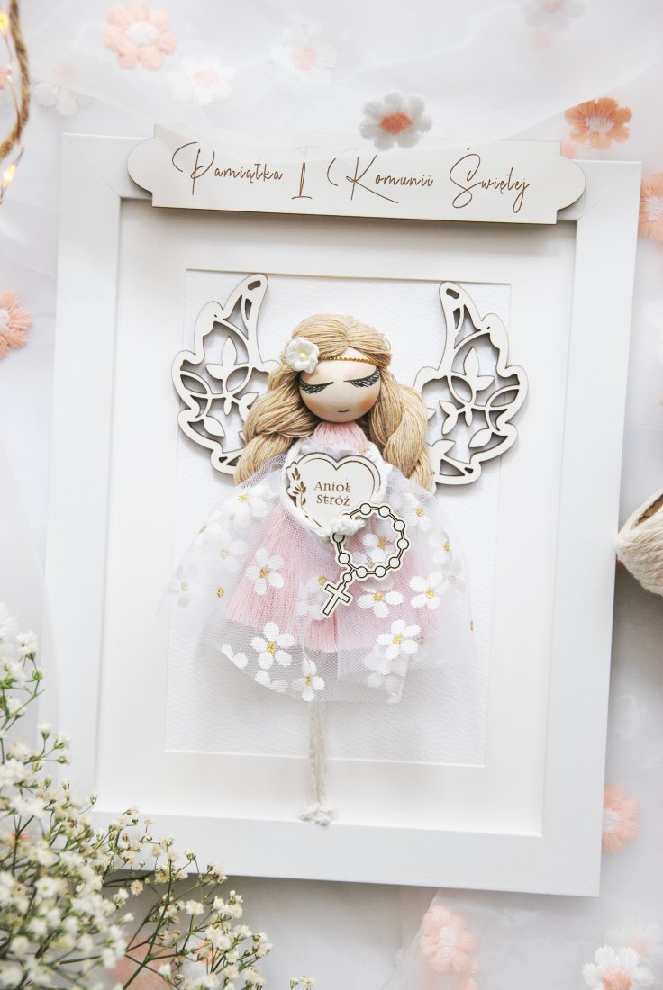 Delikatna i wyjątkowa pamiątka Pierwszej Komunii Świętej dla dziewczynki, która zachwyca subtelnym designem i starannym wykonaniem. W eleganckiej białej ramce znajduje się uroczy aniołek o miękkich, jasnych włosach i skrzydłach, ubrany w koronkową sukienkę, która dodaje całości lekkości i wdzięku. Całość dopełniają elementy z białego HDF.