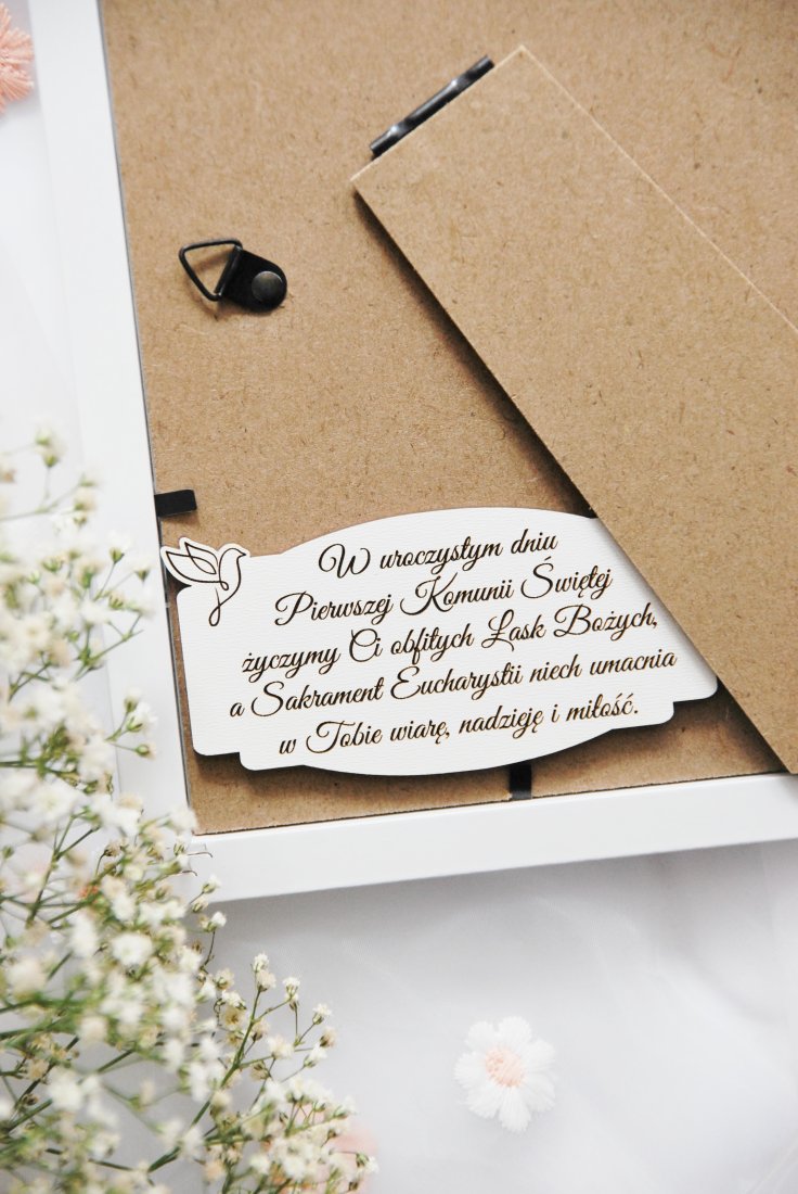Na górze umieszczony jest napis "Pamiątka Pierwszej Komunii Świętej", dzięki czemu ta propozycja idealnie wpisuje się w charakter tej ważnej uroczystości. To nie tylko dekoracja, ale przede wszystkim sentymentalna pamiątka na lata, która będzie przypominać o jednym z najważniejszych dni w życiu dziecka.