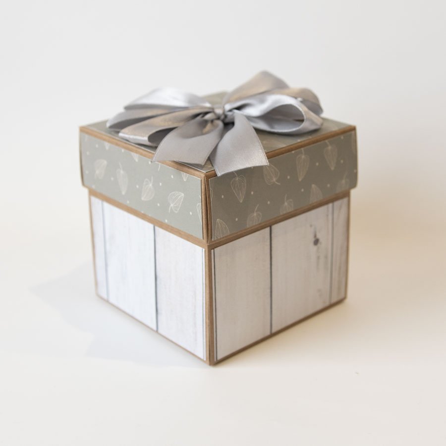 Wymiary złożonego pudełka to 10x10x10cm, po rozłożeniu kartka ma aż 30cm szerokości! Całość utrzymana jest w delikatnych, stonowanych barwach.