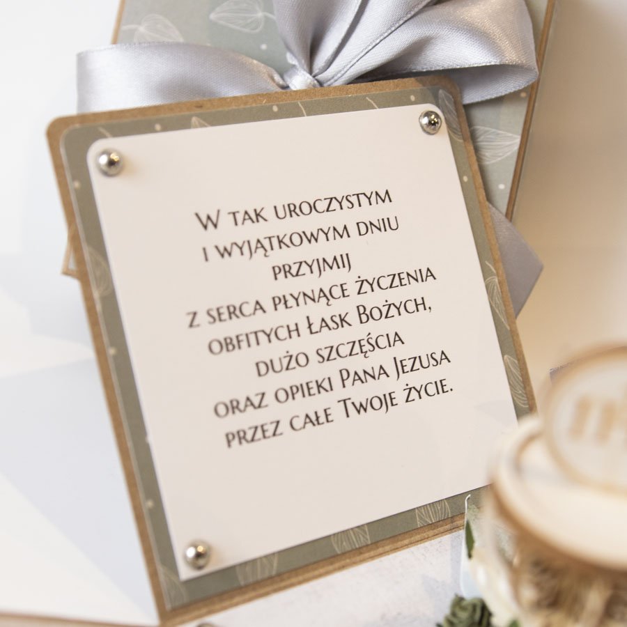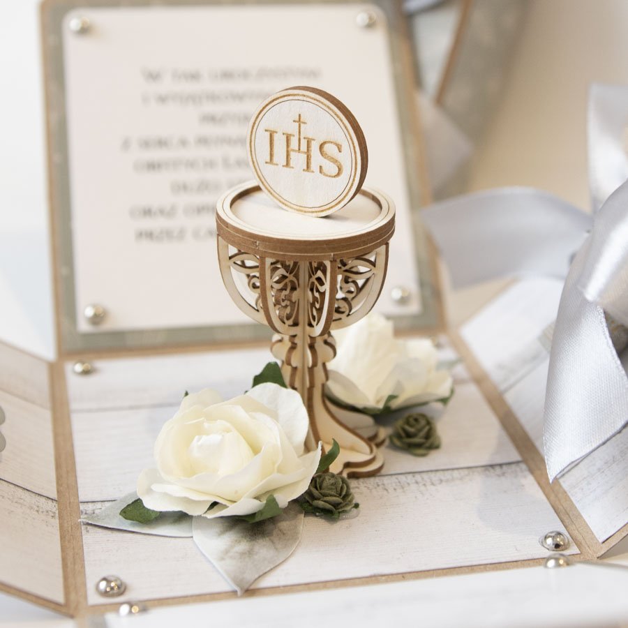 Na środku pudełeczka znajduje się dekoracja - miniaturowy kielich z hostią. Na ściankach znajduje się motyw hostii, życzenia dla dziecka, miejsce na odręczny podpis osoby wręczającej prezent oraz miejsce na pieniądze (zwija się je w rulonik i przewiązuje satynową kokardą.