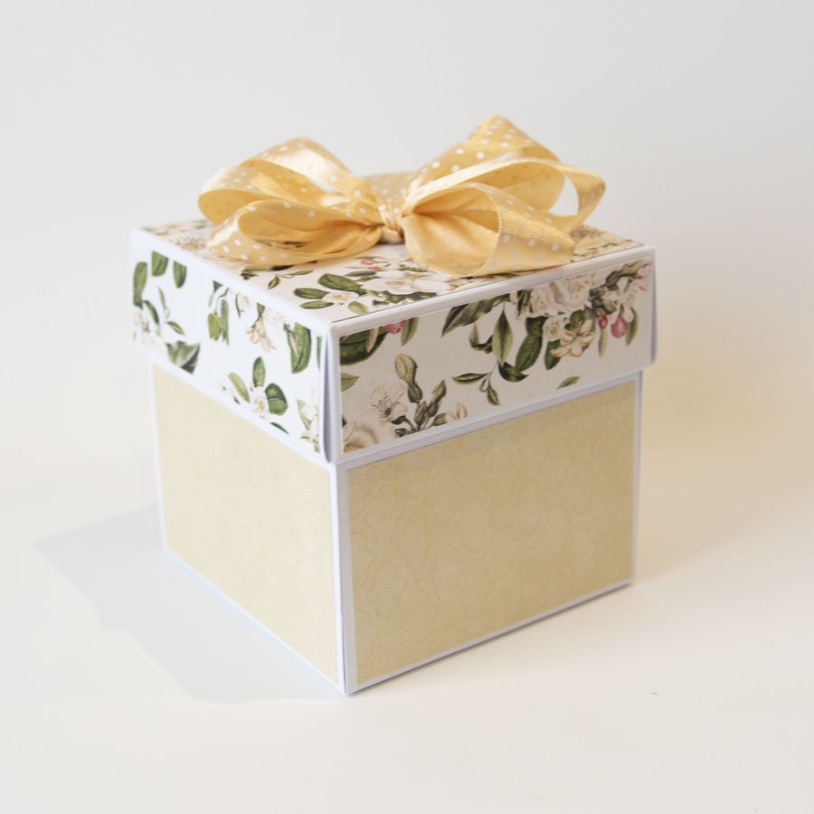 Wymiary złożonego pudełka to 10x10x10cm, po rozłożeniu kartka ma aż 30cm szerokości! Całość utrzymana jest w delikatnych, stonowanych barwach.