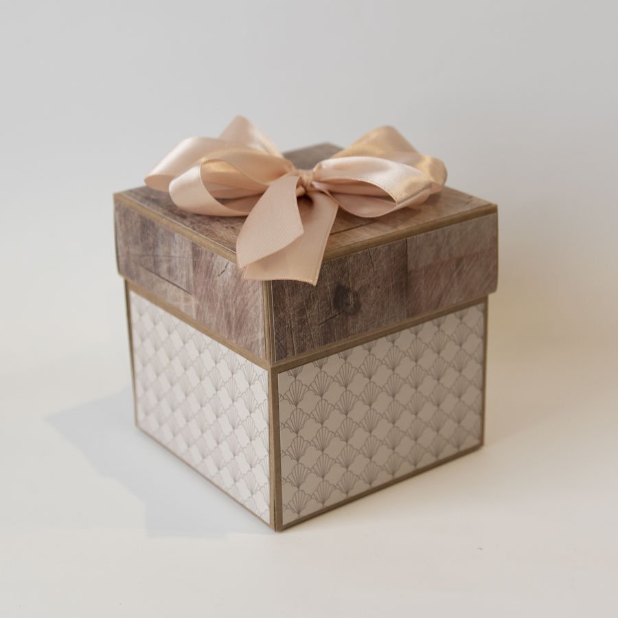 Wymiary złożonego pudełka to 10x10x10cm, po rozłożeniu kartka ma aż 30cm szerokości! Całość utrzymana jest w delikatnych, stonowanych barwach.