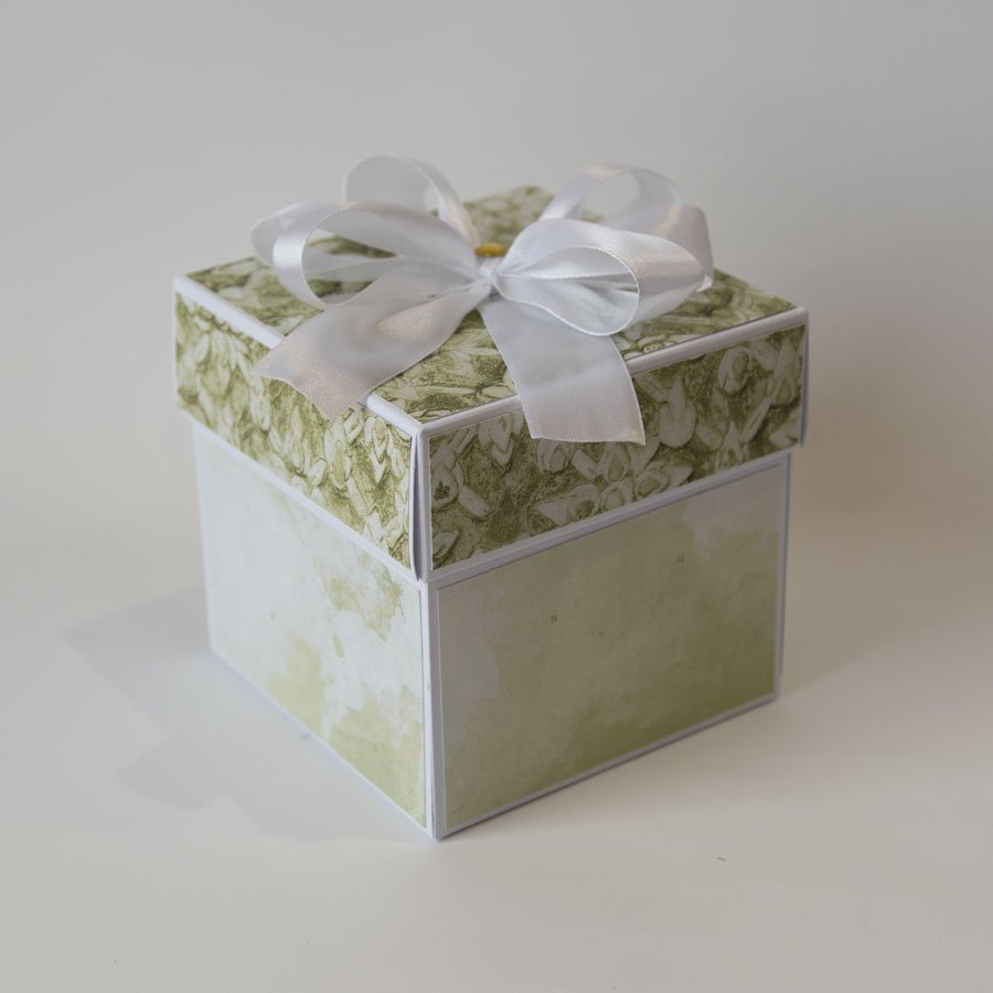 Wymiary złożonego pudełka to 10x10x10cm, po rozłożeniu kartka ma aż 30cm szerokości! Całość utrzymana jest w delikatnych, stonowanych barwach.