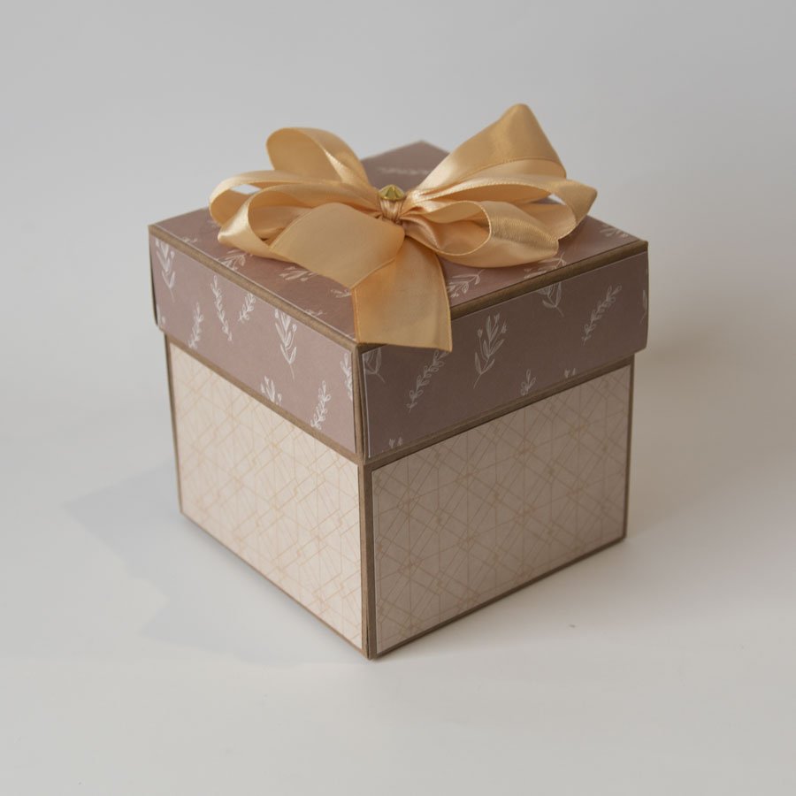 Wymiary złożonego pudełka to 10x10x10cm, po rozłożeniu kartka ma aż 30cm szerokości! Całość utrzymana jest w delikatnych, stonowanych barwach.