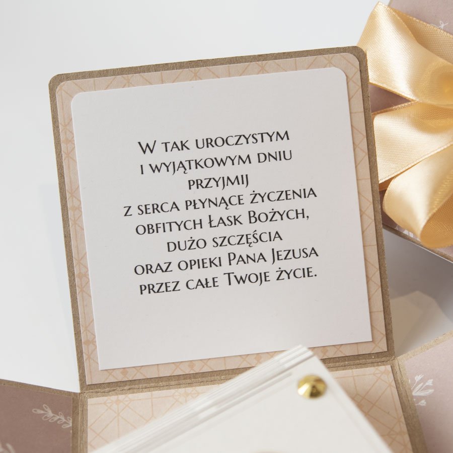 Na środku pudełeczka znajduje się dekoracja - miniaturowa księga, która otwiera się stanowiąc jednocześnie pudełeczko na prezent. Na ściankach znajduje się motyw krzyża, życzenia dla dziecka, miejsce na odręczny podpis osoby wręczającej prezent oraz kielich z hostią.