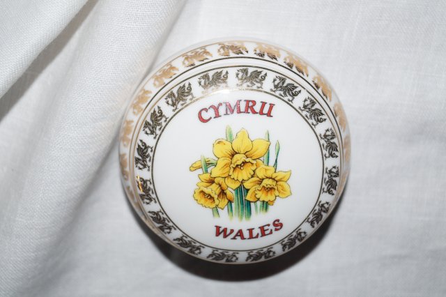 Urocze porcelanowe puzderko- pamiątka z WALII, wykonane z białej porcelany szkliwionej na błyszcząco, ozdobione dwoma narodowymi symbolami Walii:żonkilem i smokiem, który pojawia się na fladze, zgrabne, klasyczny kształt, przyjemna ozdoba