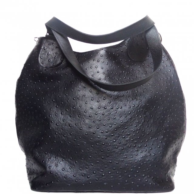 Duża czarna torba uszyta ze skóry fakturowanej we wzór strusia. Skóra miękka, z naturalnym lekkim połyskiem.