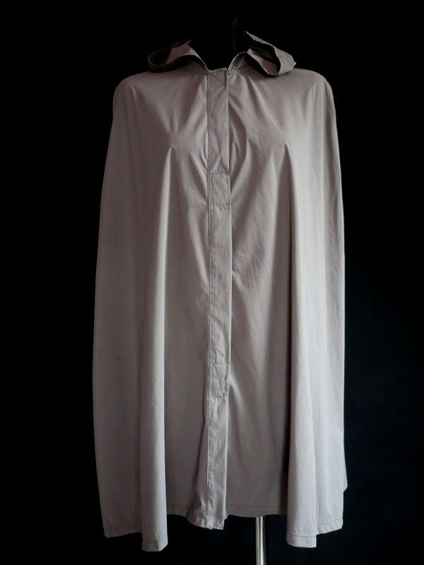 Peleryna z cienkiej tkaniny zapinana na rzepy.Dopasowany kaptur zaszewkami. W kolorze beżowo-szarym.Pelerynka nie ma rozcięć na dłonie, tkanina jest z rodzaju ortalionu ale dosyć cienka i raczej przemakalna, raczej jako wiatrówka.