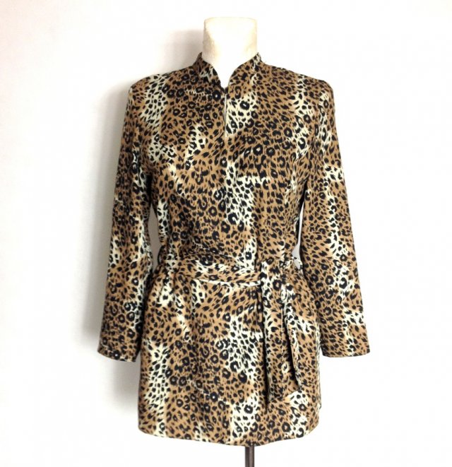Sukienka/tunika/bluzka jak kto woli, w bardzo modny w tym sezonie panterkowy deseń, rozkloszowana, ze stójką, z tyłu suwak, w komplecie z paskiem, bo bokach rozcięcia.Z przodu malutki dekolt w kształcie łezki z guziczkiem.