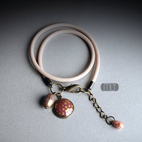 Efektowna bransoletka wykonana z linki kauczukowej w kolorze beżowym, elementów w kolorze starego złota i ręcznie wykonanej ceramicznej zawieszki, szkliwionej mieszanką różowych szkliw z efektem złotych plamek o subtelnym połysku, Obwód regulowany. Polecam