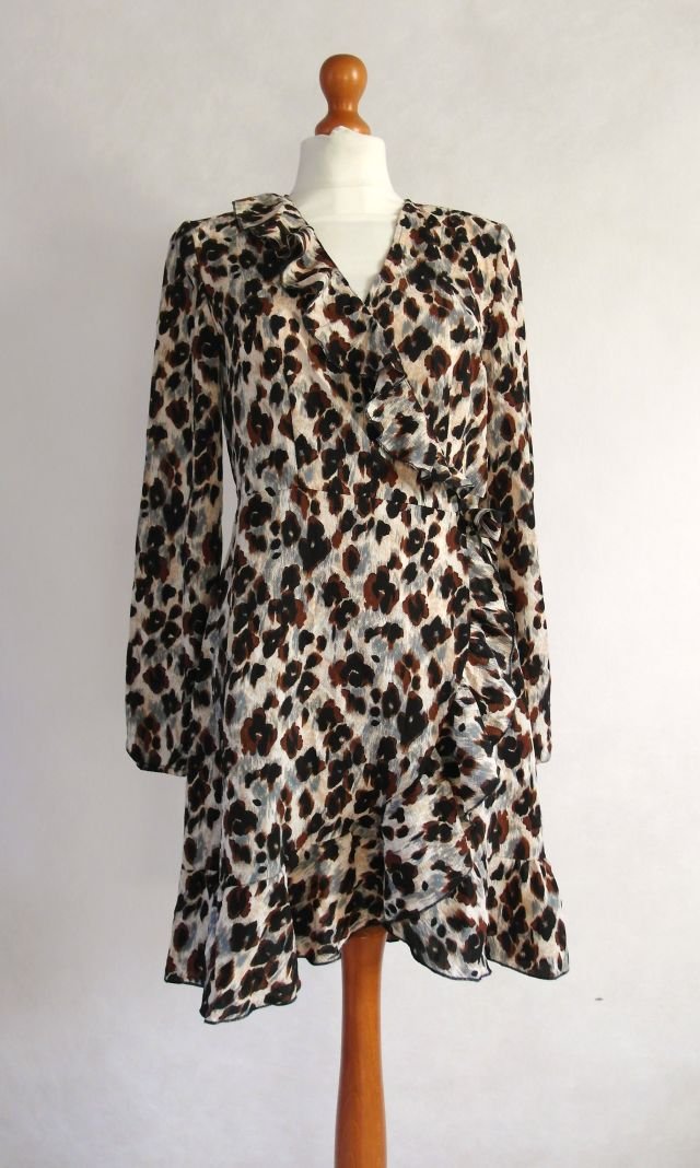 modny wzór - beżowe tło i brązowo czarne kwiaty z szarymi akcentami, które przypominają cętki. wzdłuż jednej poły biegnie falbanka, która wieńczy dół sukienki.rękawy zakończone gumką.kopertowe wiązanie daje więcej możliwości dopasowania sukienki do figury.