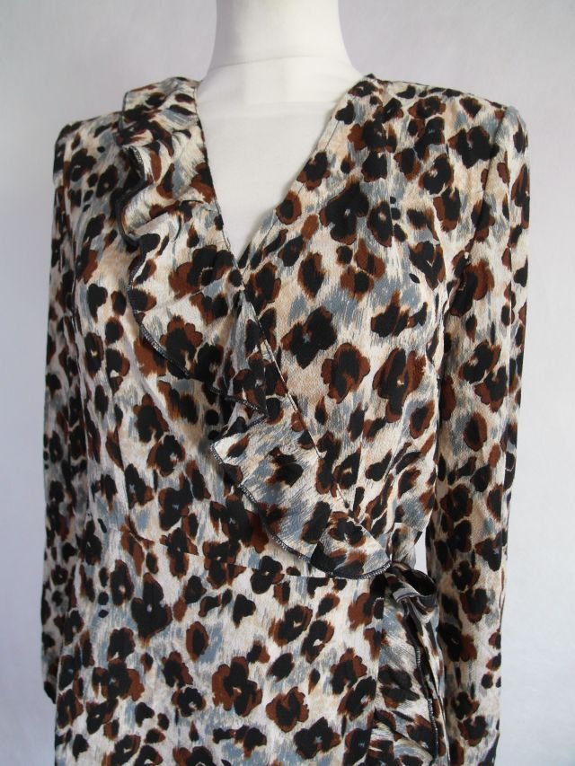 modny wzór - beżowe tło i brązowo czarne kwiaty z szarymi akcentami, które przypominają cętki. wzdłuż jednej poły biegnie falbanka, która wieńczy dół sukienki.rękawy zakończone gumką.kopertowe wiązanie daje więcej możliwości dopasowania sukienki do figury.