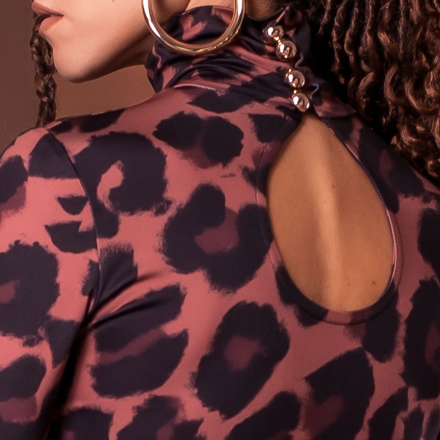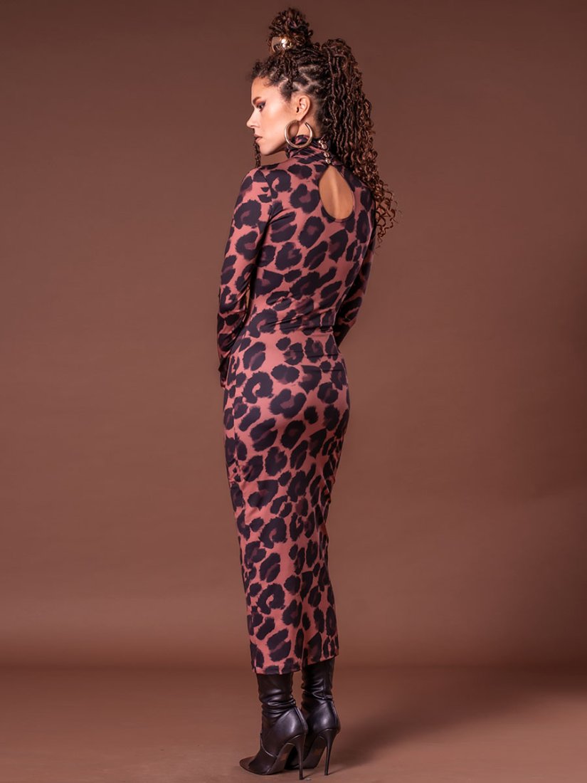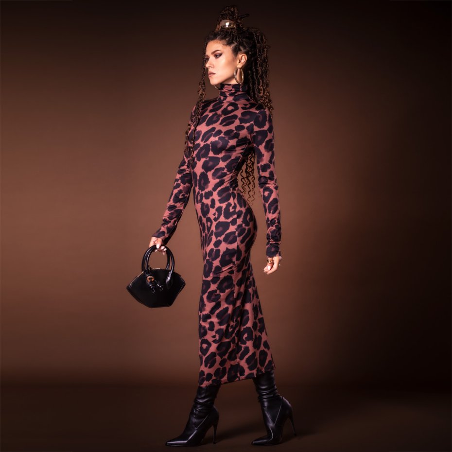 Ta sukienka to kwintesencja elegancji i nowoczesności. Wykonana z jerseyu z autorskim deseniem w panterkę. Góra sukienki została zaprojektowana w stylu naszego bestsellerowego golfu – zapięcie na złote guziki z tyłu pozwala na idealne dopasowanie do szyi, bez obaw o rozciąganie czy zniszczenie fryzury i makijażu.