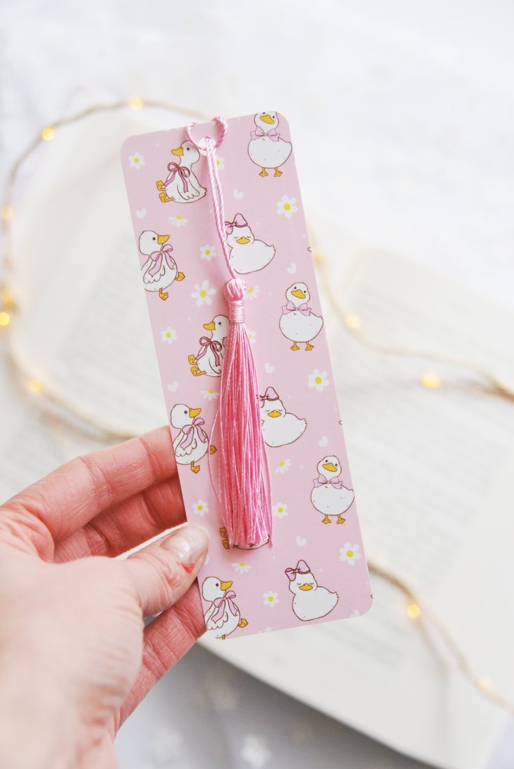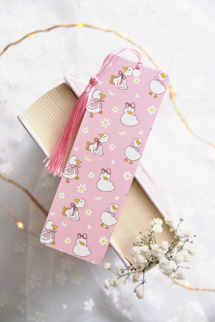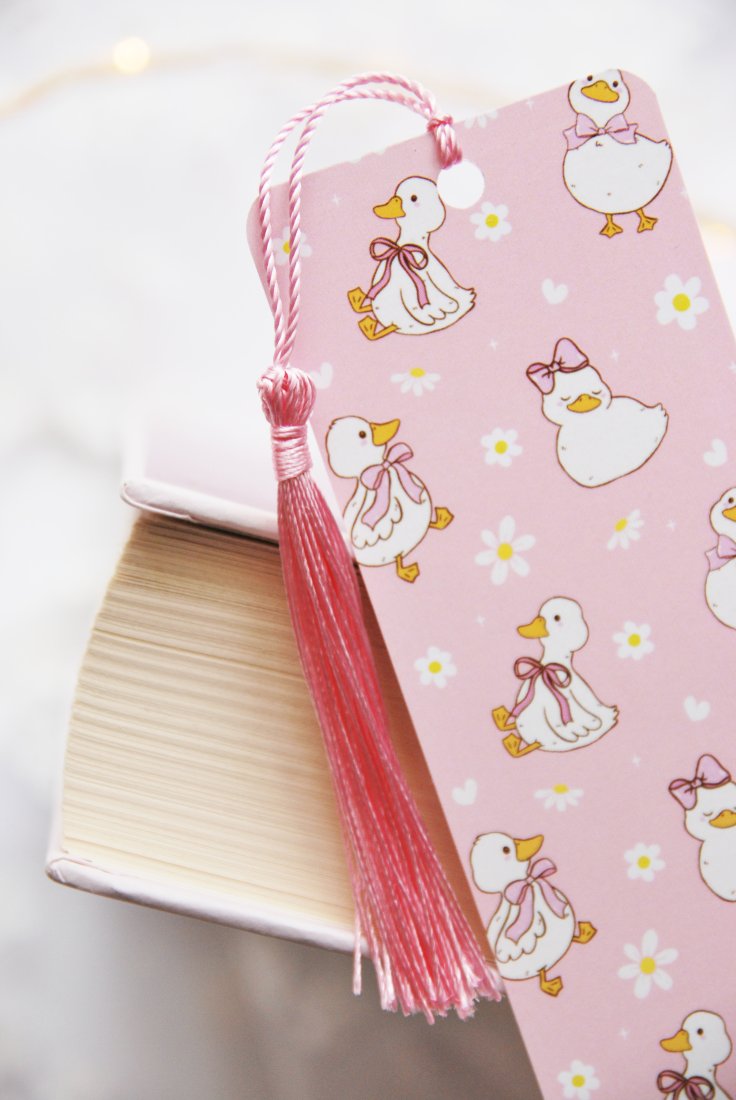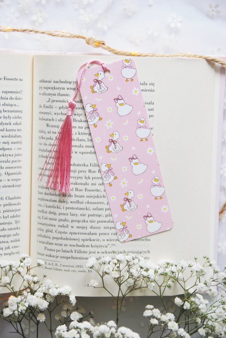 Ta urocza papierowa zakładka to prawdziwy must-have dla każdej miłośniczki czytania. Na różowym tle tańczą białe kaczuszki w kokardkach otoczone stokrotkami - idealne towarzystwo do każdej historii, od romansu po fantasy. Ozdobny różowy chwost sprawia, że zakładka wygląda jak prezent sama w sobie. Bo dobra książka zasługuje na równie dobrą zakładkę!